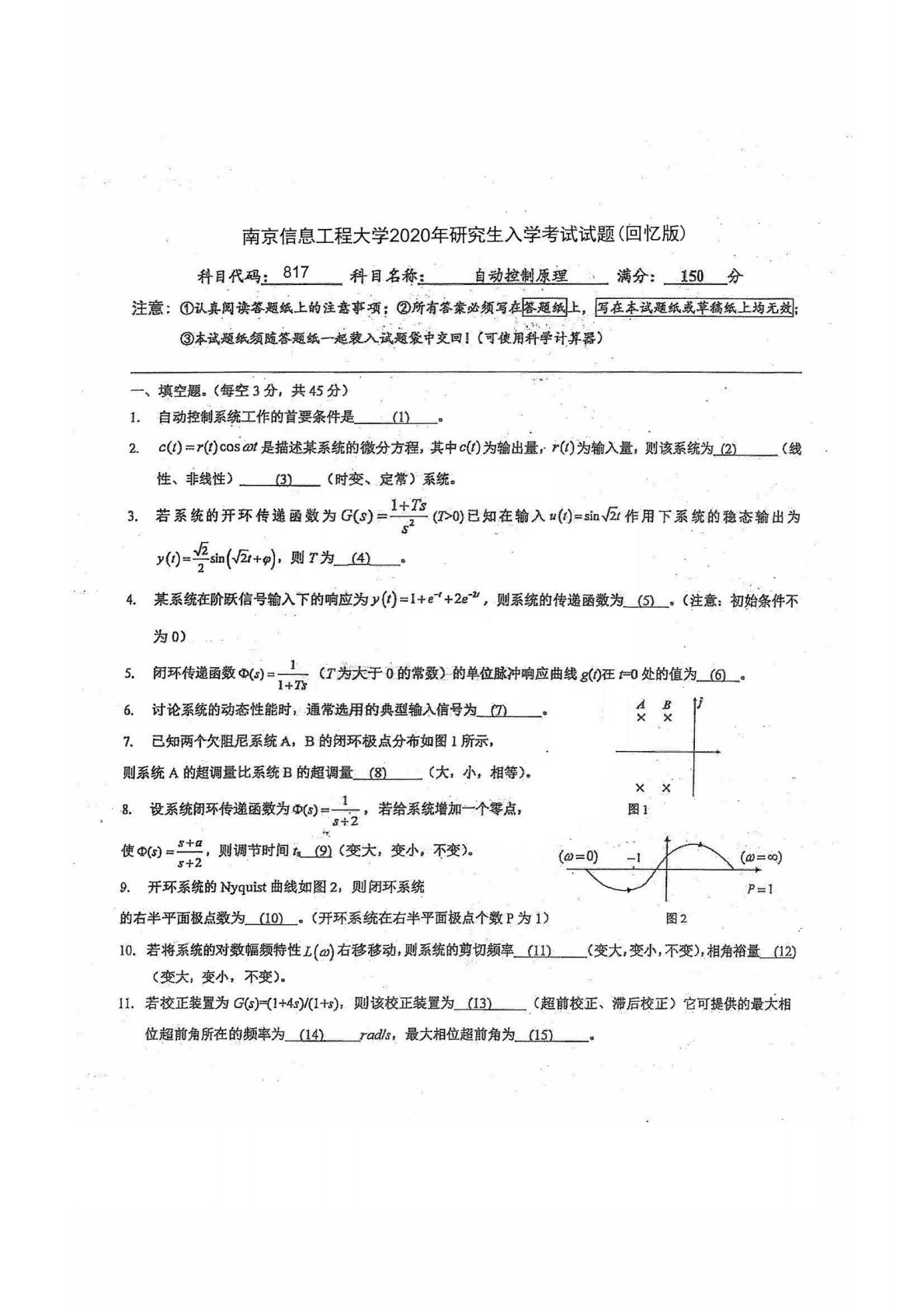 南京信息工程大学817自动控制原理2020年真题