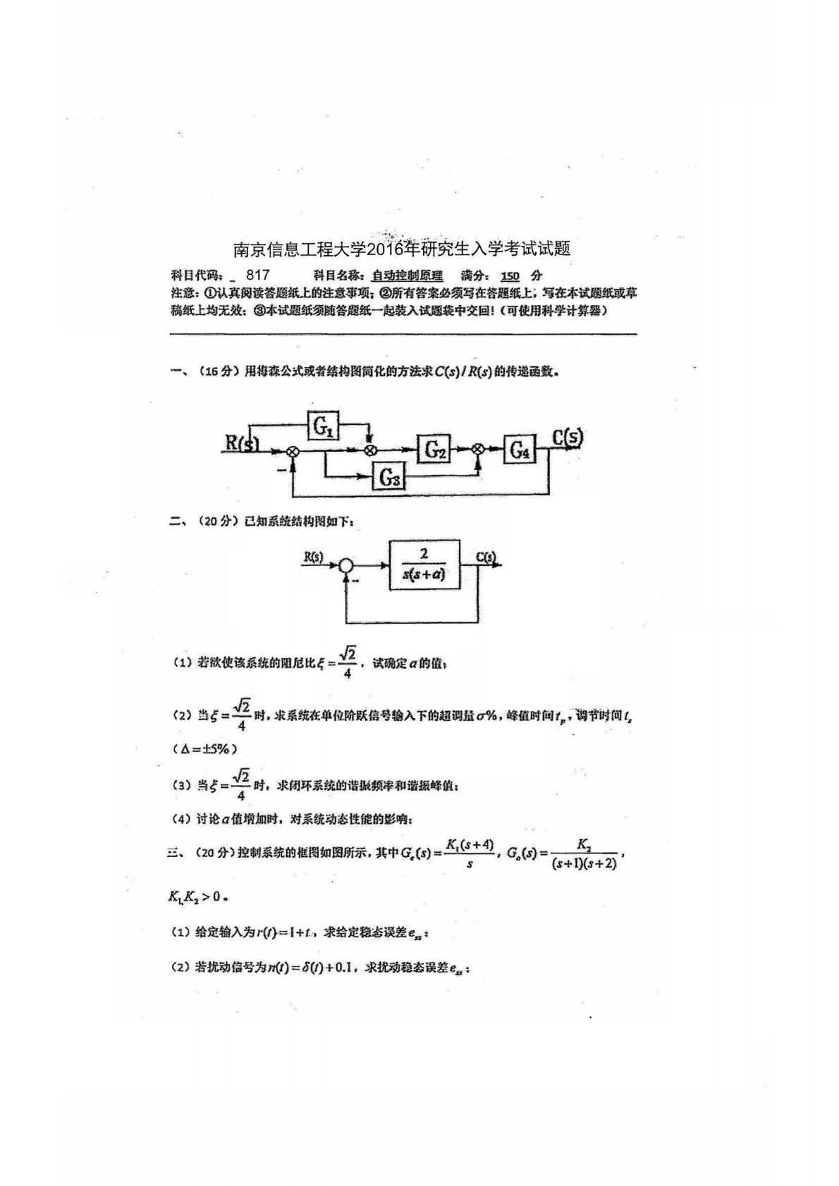 南京信息工程大学817自动控制原理2016年真题