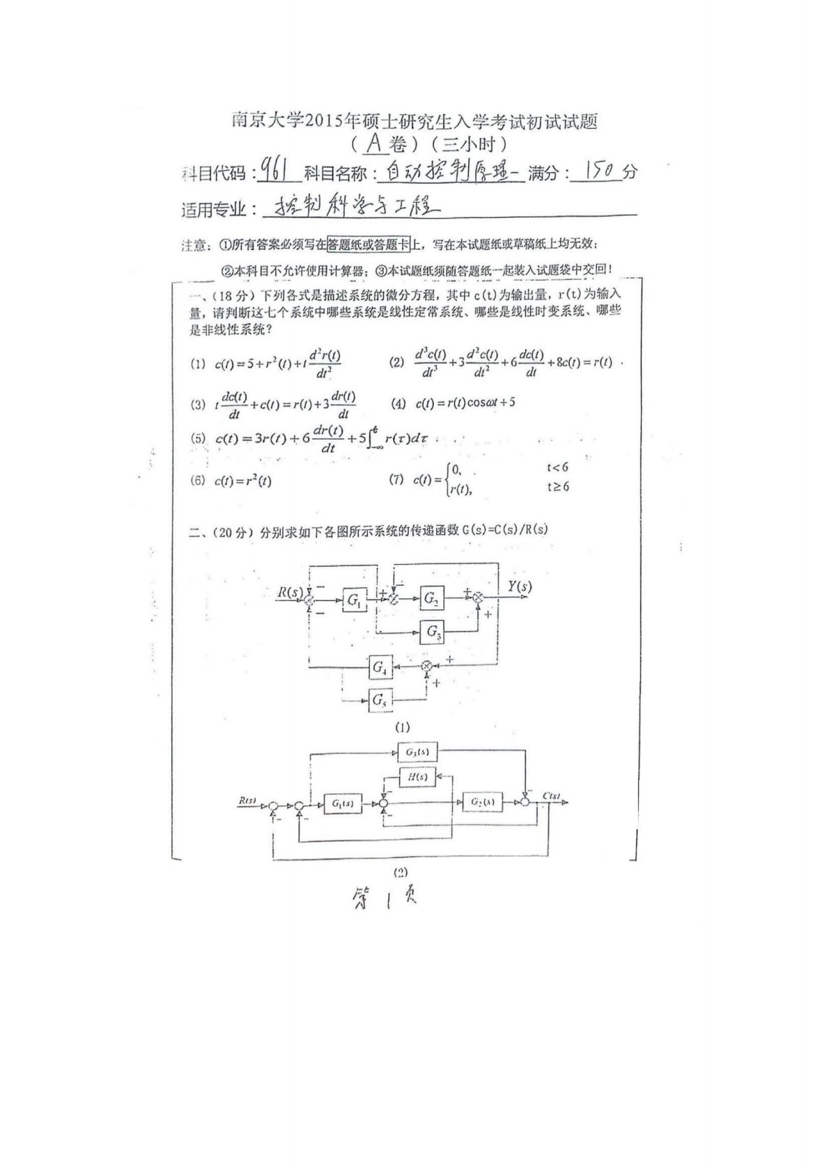 南京大学961自动控制原理(经典60%、现代40%)2015年真题