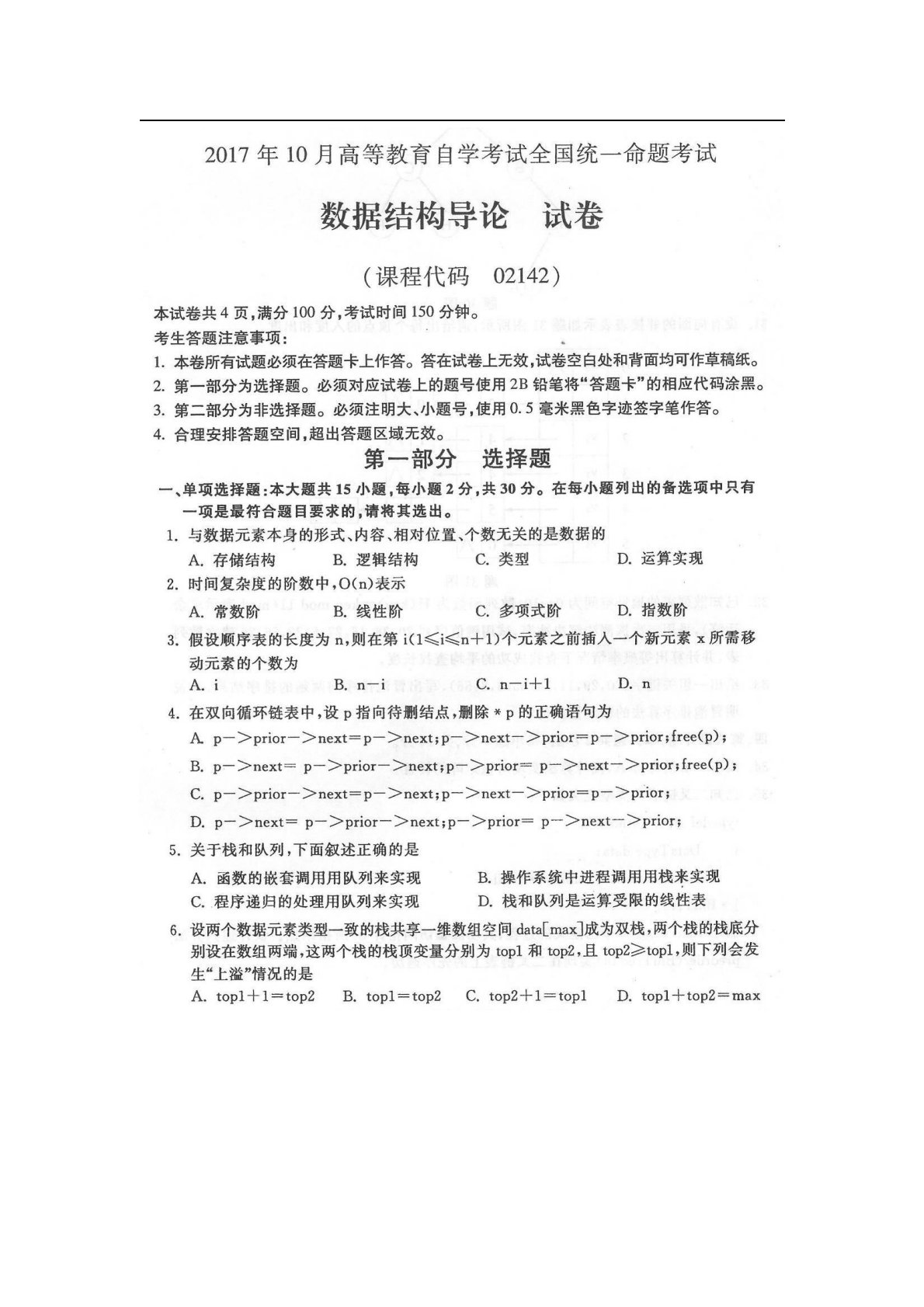 内蒙古科技大学810数据结构2017年10月全国卷
