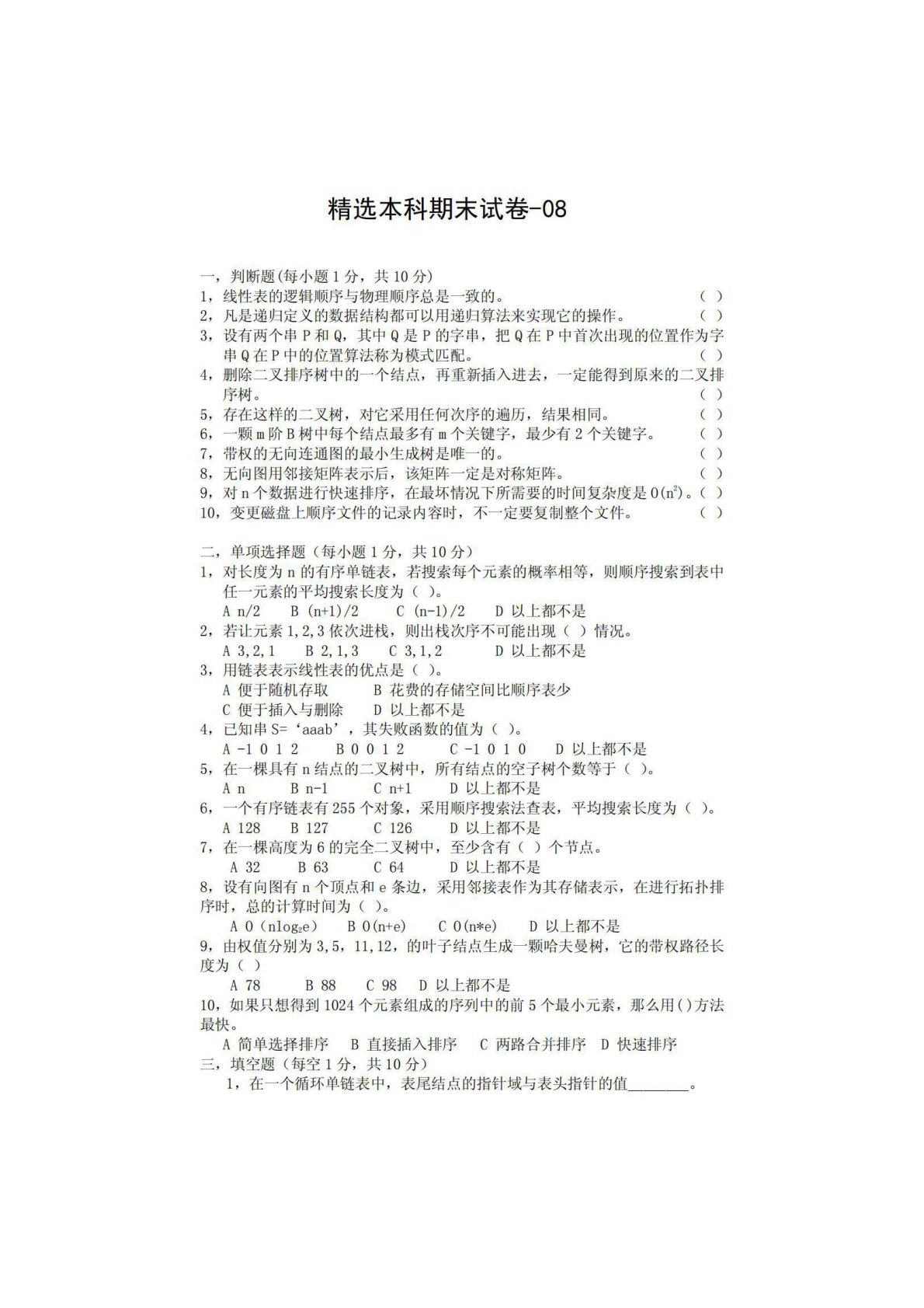 南京邮电大学811数据结构精选本科期末试卷8