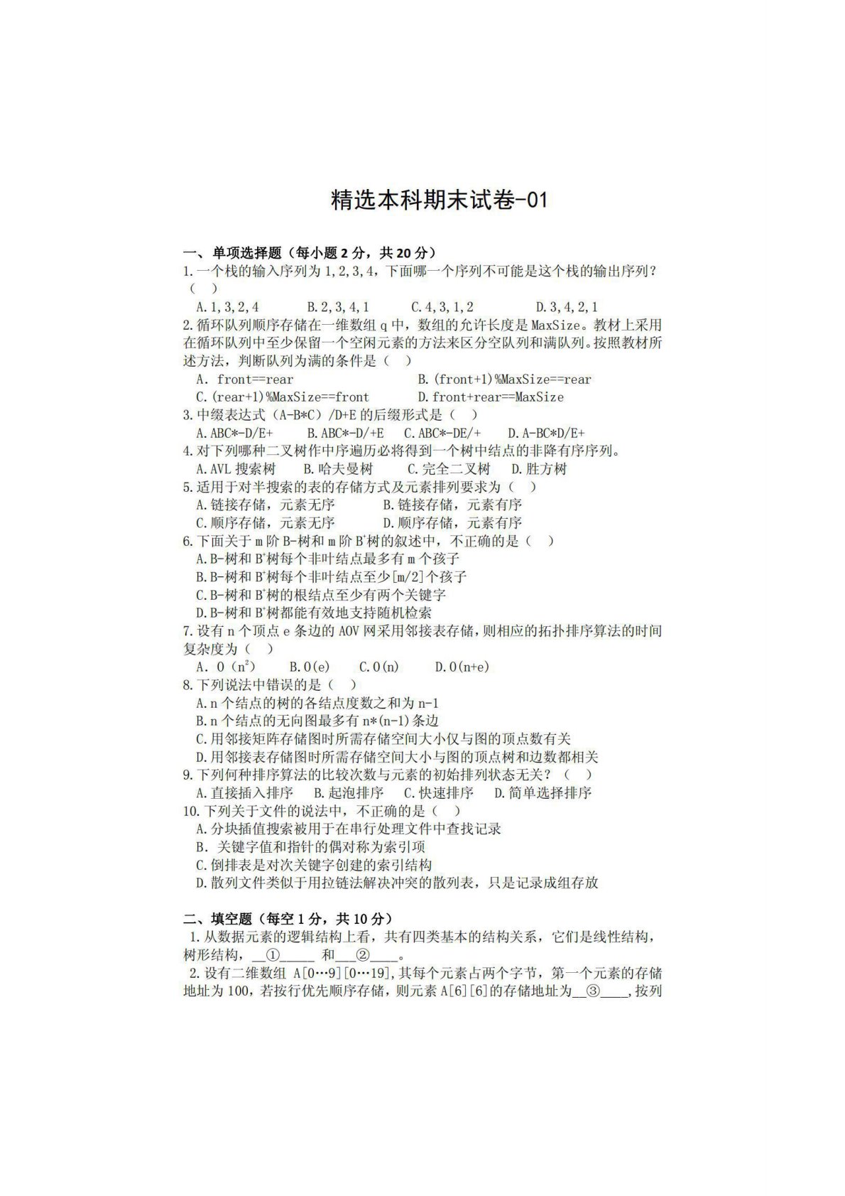 南京邮电大学811数据结构精选本科期末试卷1