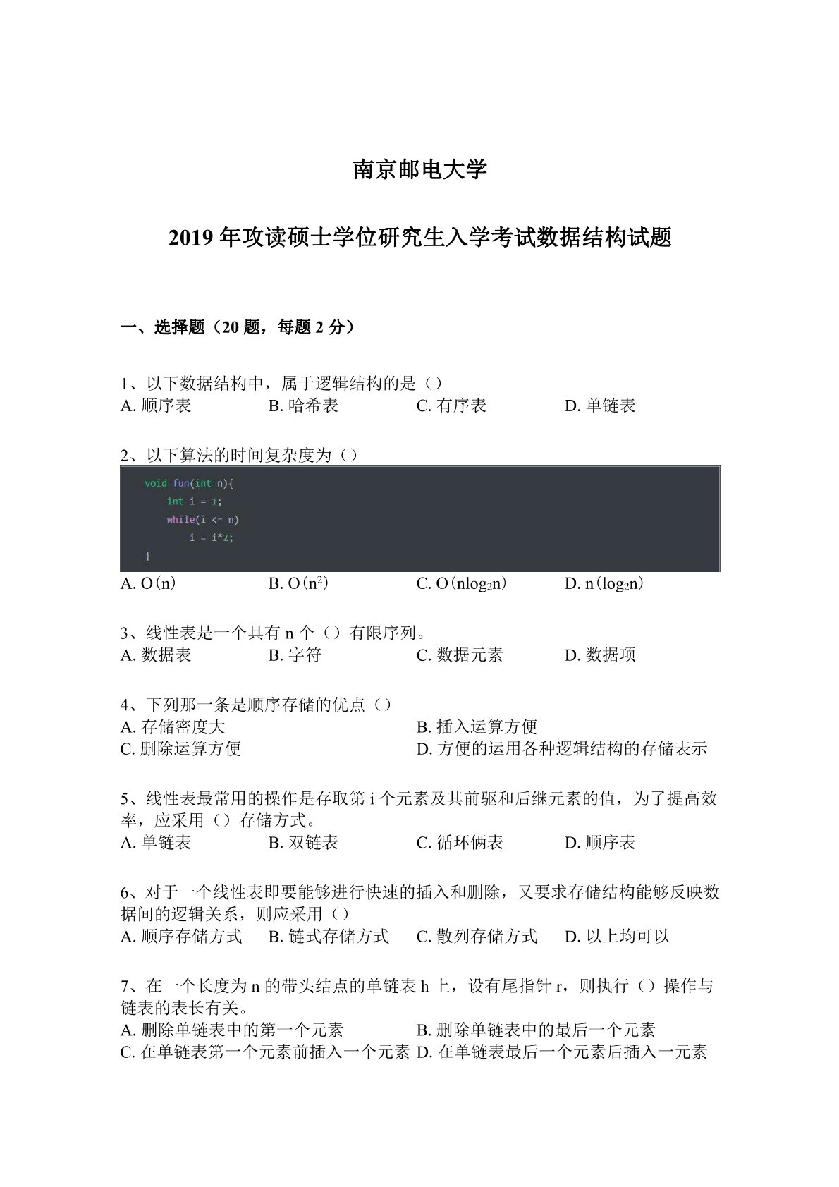 南京邮电大学811数据结构2019年真题