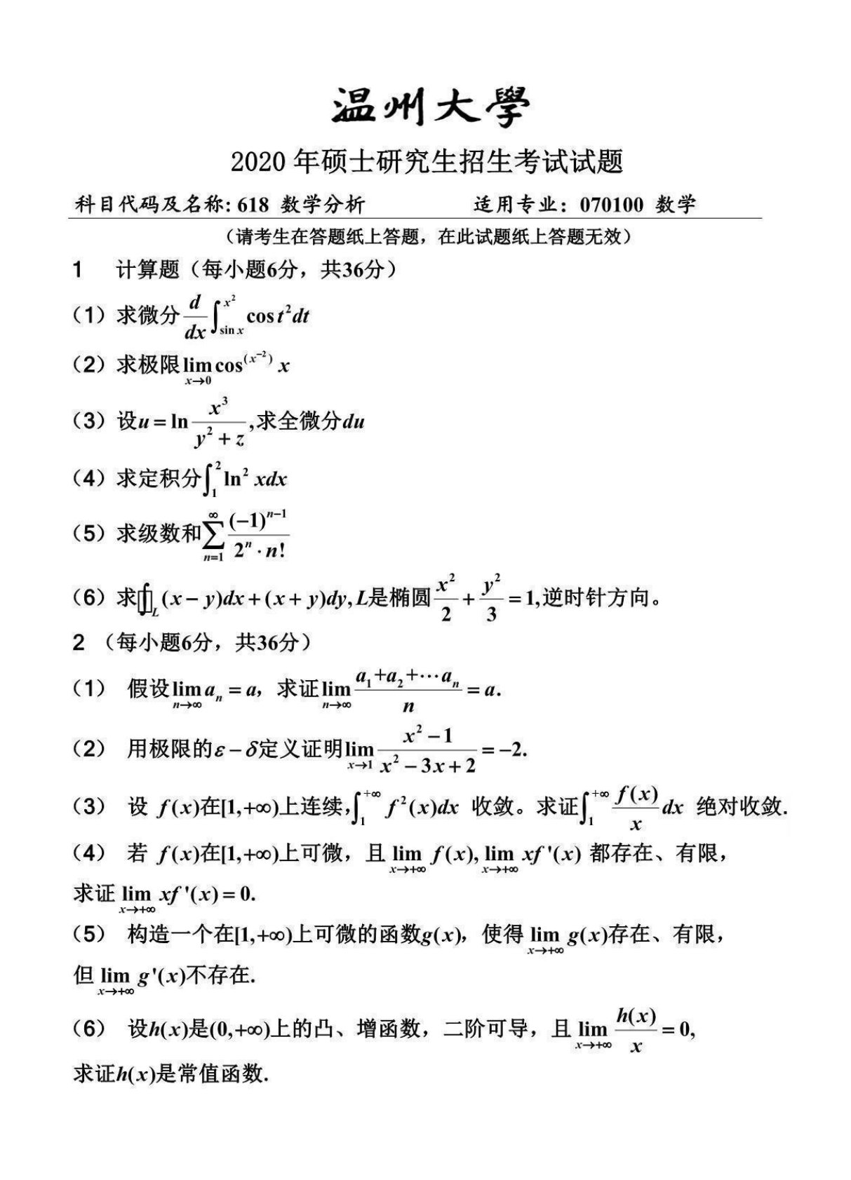 温州大学618数学分析2020年真题