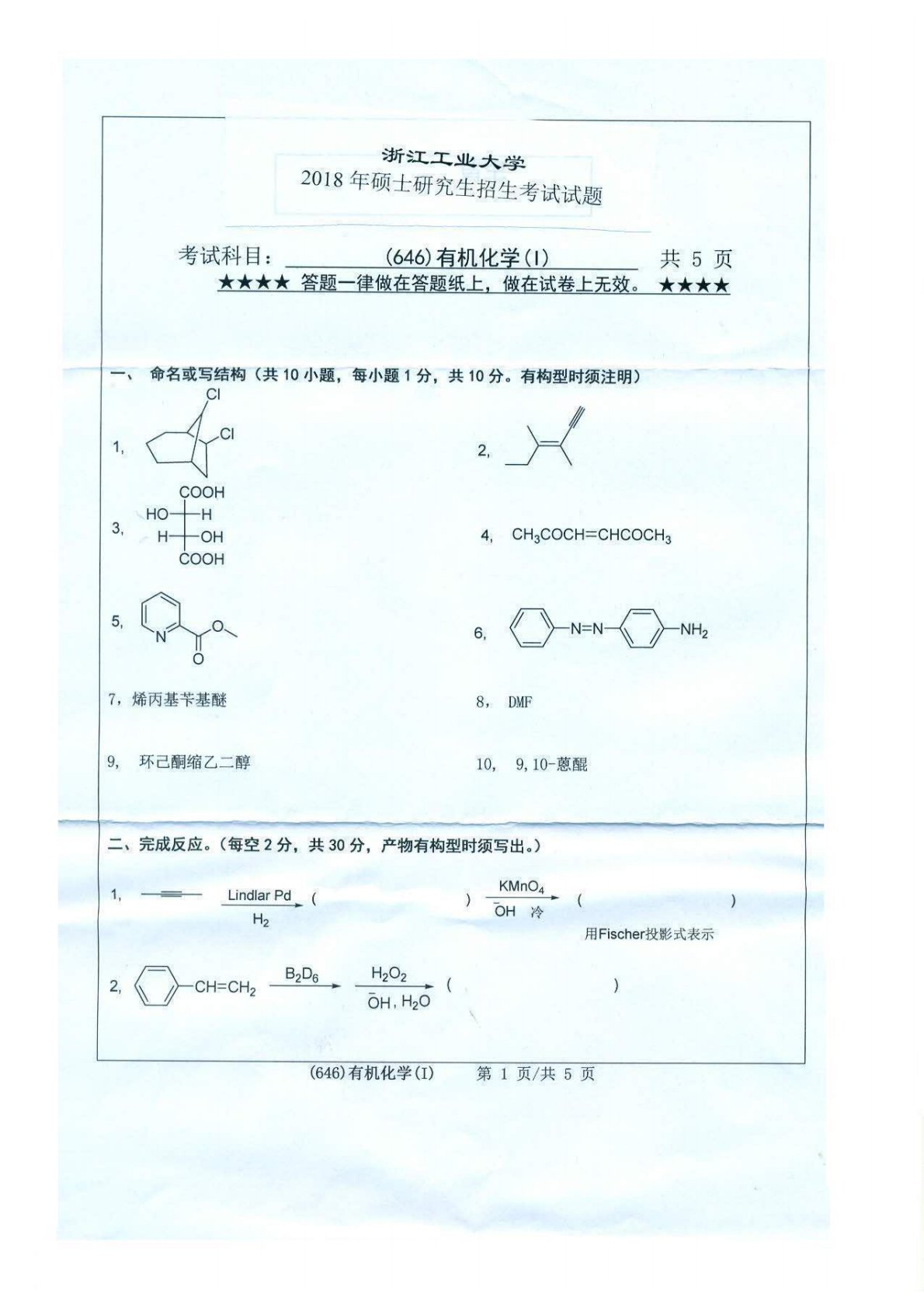 浙江工业大学646有机化学2018年真题