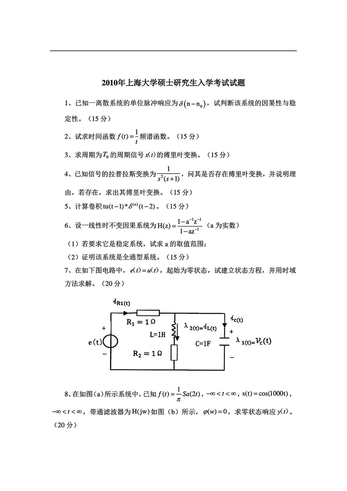 上海大学829信号系统与电路2010年真题