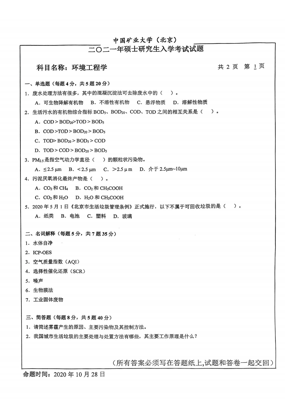 中国矿业大学(北京)847环境工程学2021年真题