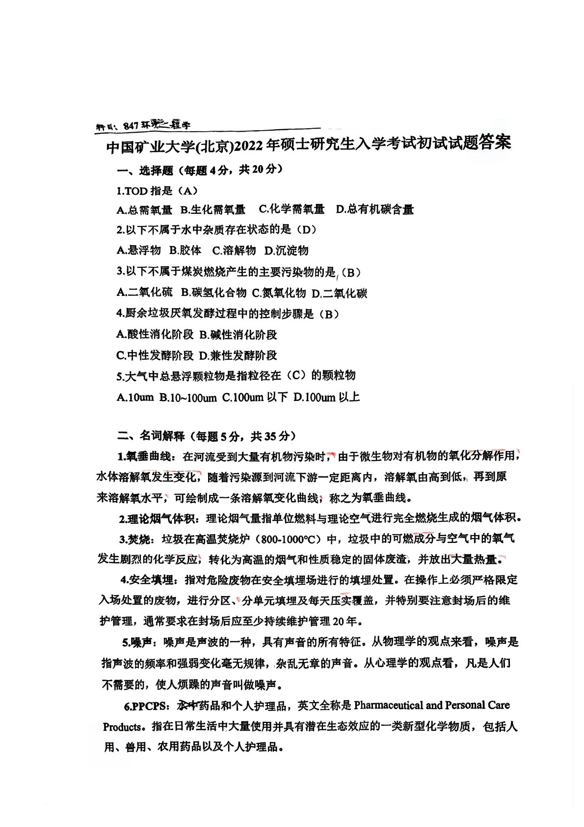 中国矿业大学(北京)847环境工程学2022年真题及答案