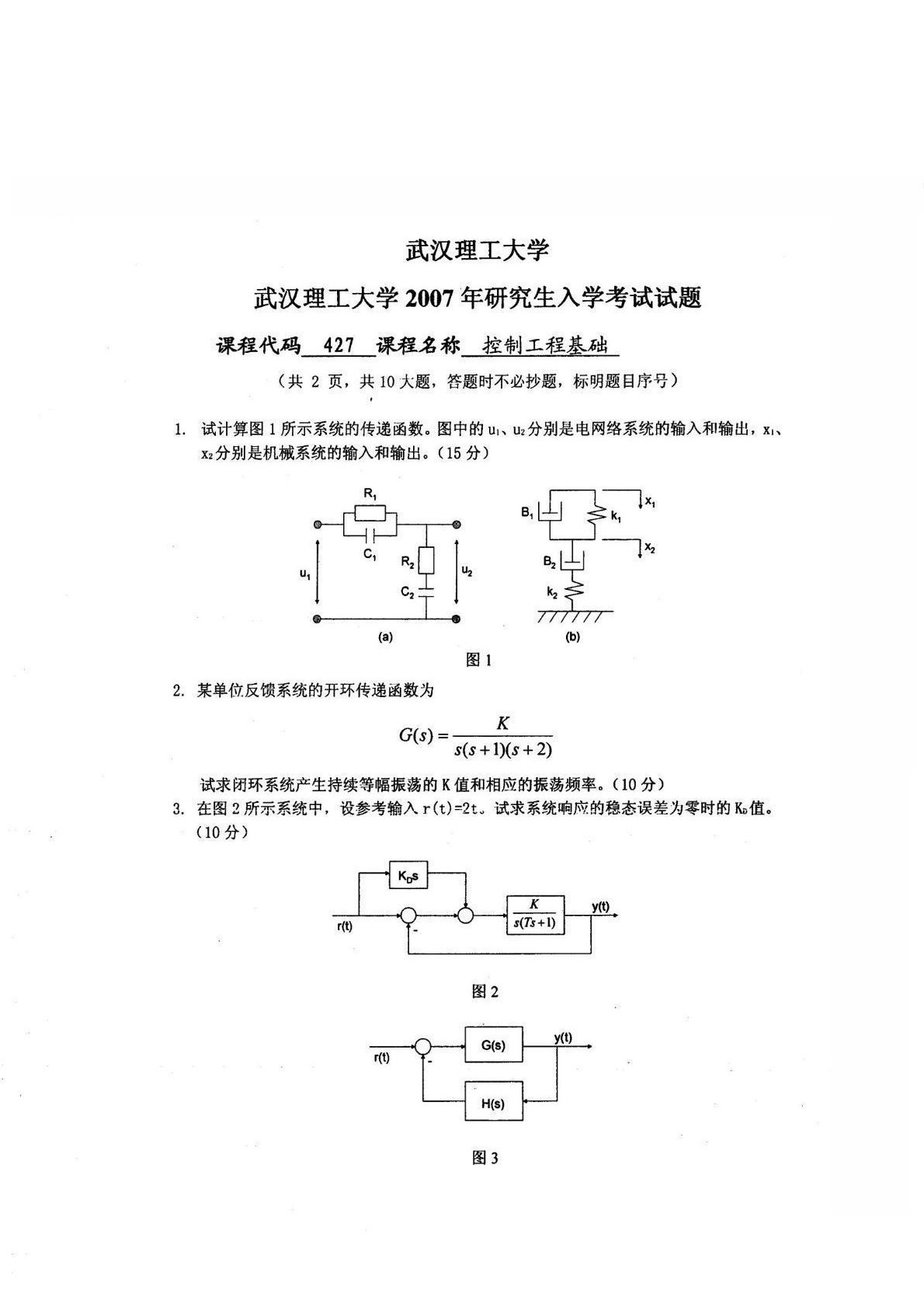 武汉理工大学840控制工程基础2007年真题