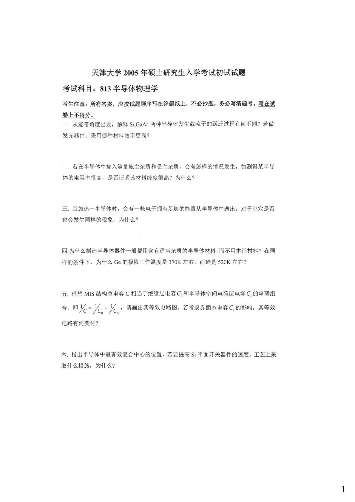 天津大学813半导体物理与器件2005年真题