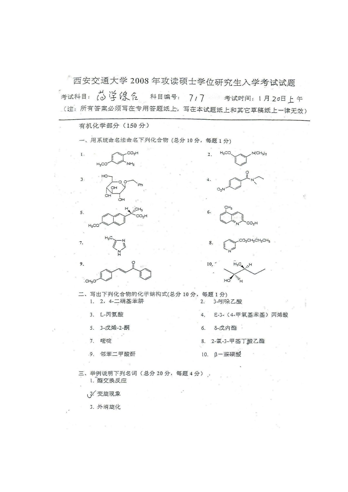西安交通大学717药学基础综合2008年真题