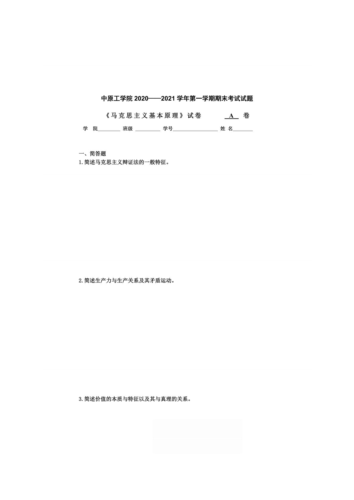 中原工学院612马克思主义基本原理2020年期末考试题