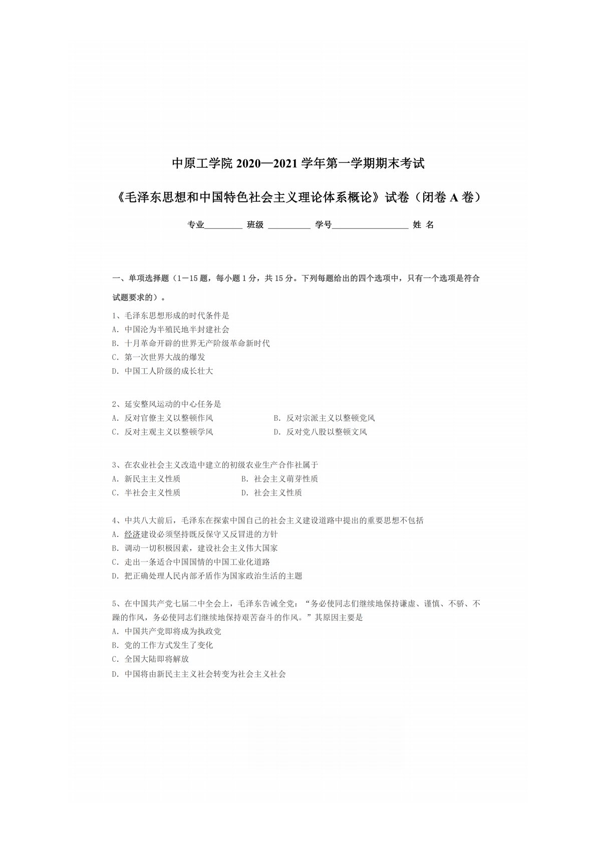 中原工学院802毛泽东思想和中国特色社会主义理论体系概论2020年期末考试题