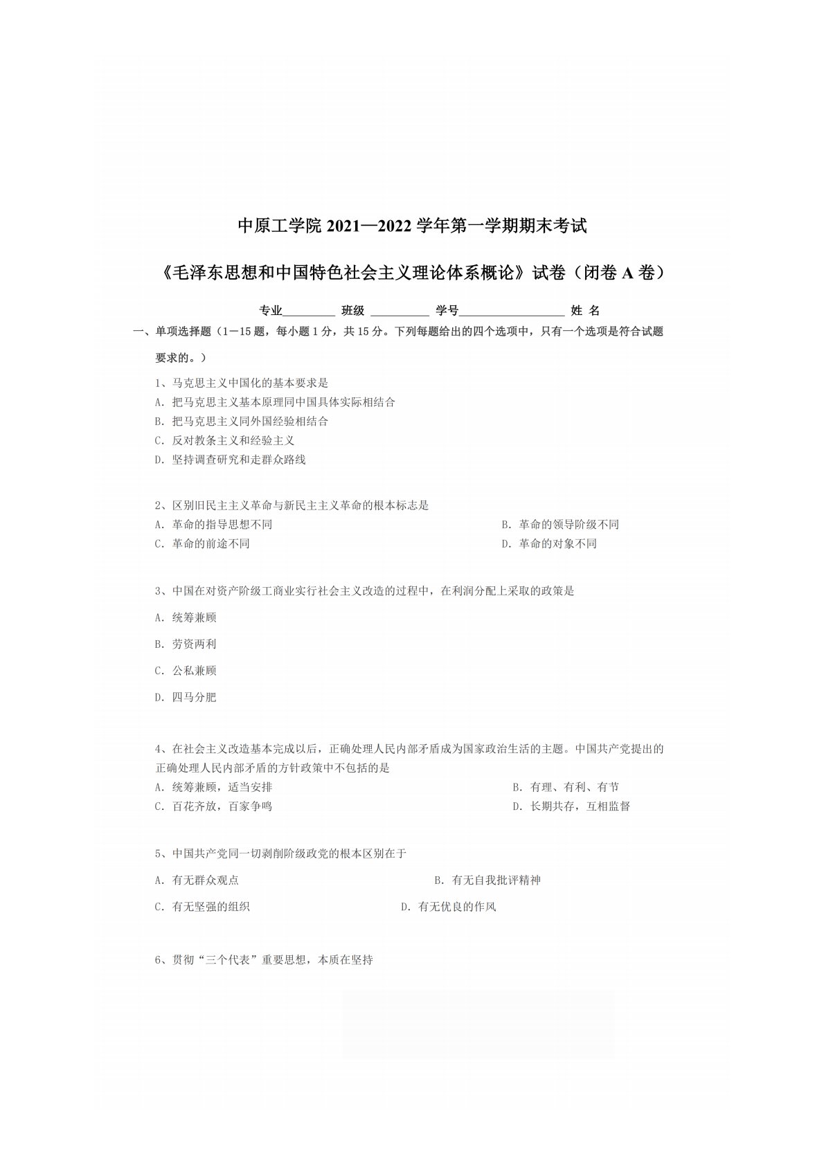 中原工学院802毛泽东思想和中国特色社会主义理论体系概论2021年期末考试题