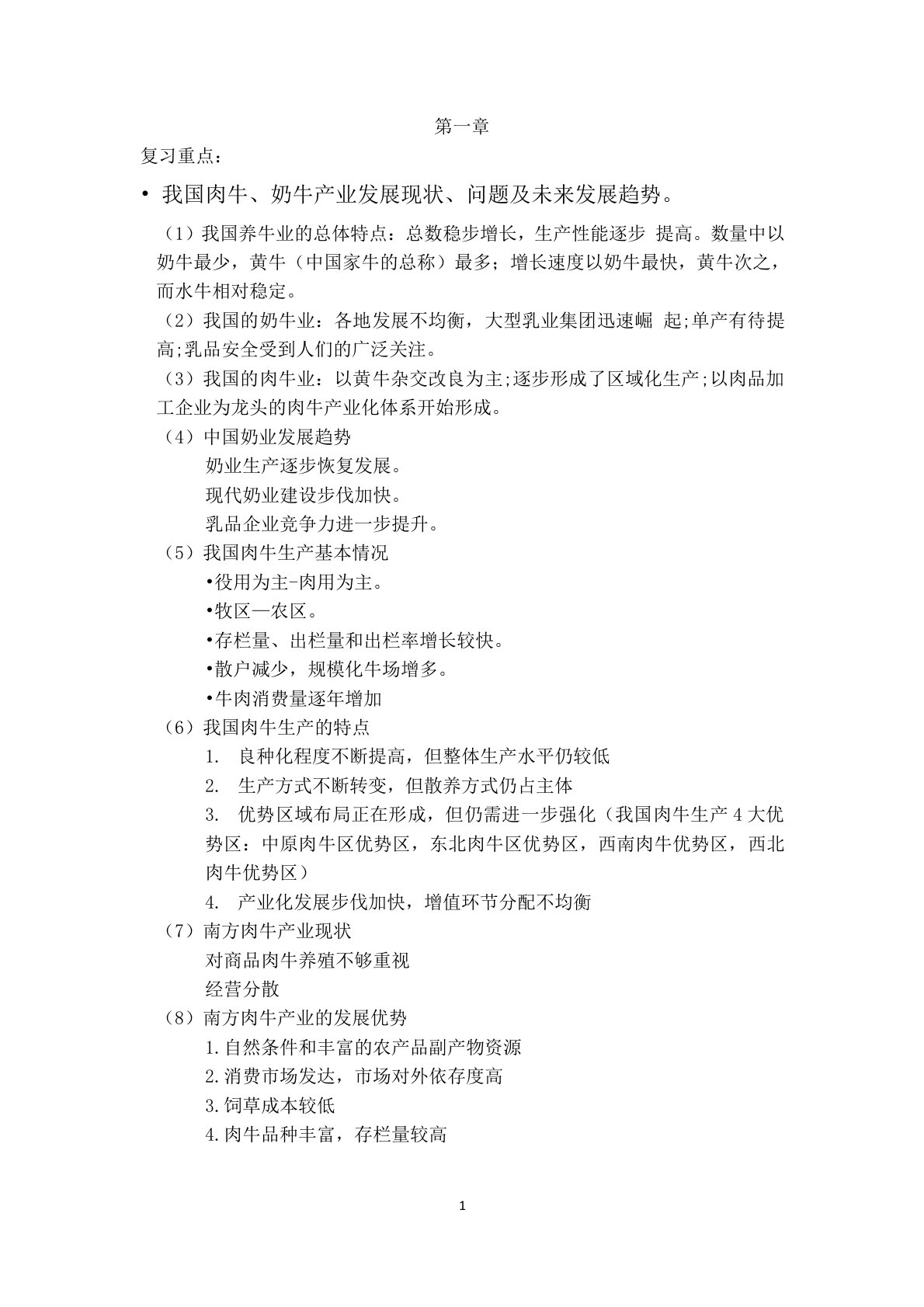 第一章复习重点:•我国肉牛、奶牛产业发展现状、问题及未来发展趋势。(1)我国养牛业的总体特点:总数稳步增长,生产性能逐步提高。数量中以奶牛最少,黄牛(中国家牛的总称)最多;增长速度以奶牛最快,黄牛次之,而水牛相对稳定。(2)我国的奶牛业:各地发展不均衡,大型乳业集团迅速崛起;单产有待提高;乳品安全受到人们的广泛关注。(3)我国的肉牛业:以黄牛杂交改良为主;逐步形成了区域化生产;以肉品加工企业为龙头的肉牛产业化体系开始形成。(4)中国奶业发展趋势奶业生产逐步恢复发展。现代奶业建设步伐加快。乳品企业竞争力进一步提升。(5)我国肉牛生产基本情况•役用为主-肉用为主。•牧区—农区。•存栏量、出栏量和出...