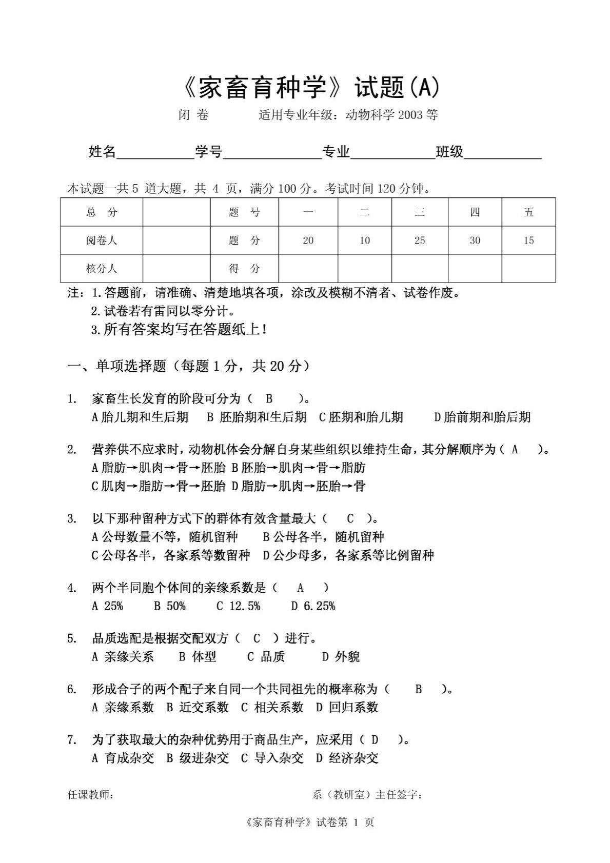 华南农业大学842畜牧学概论2006《家畜育种学》试题A(育种)