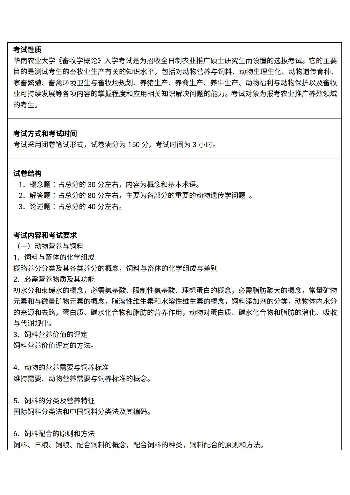 考试性质华南农业大学《畜牧学概论》入学考试是为招收全日制农业推广硕士研究生而设置的选拔考试。它的主要目的是测试考生的畜牧业生产有关的知识水平,包括对动物营养与饲料、动物生理生化、动物遗传育种、家畜繁殖、畜禽环境卫生与畜牧场规划、养猪生产、养禽生产、养牛生产、动物福利与动物保护以及畜牧业可持续发展等各项内容的掌握程度和应用相关知识解决问题的能力。考试对象为报考农业推广养殖领域的考生。考试方式和考试时间考试采用闭卷笔试形式,试卷满分为150分,考试时间为3小时。试卷结构 1.概念题:占总分的30分左右,内容为概念和基本术语。 2.解答题:占总分的80分左右,主要为各部分的重要的动物遗传学问题...