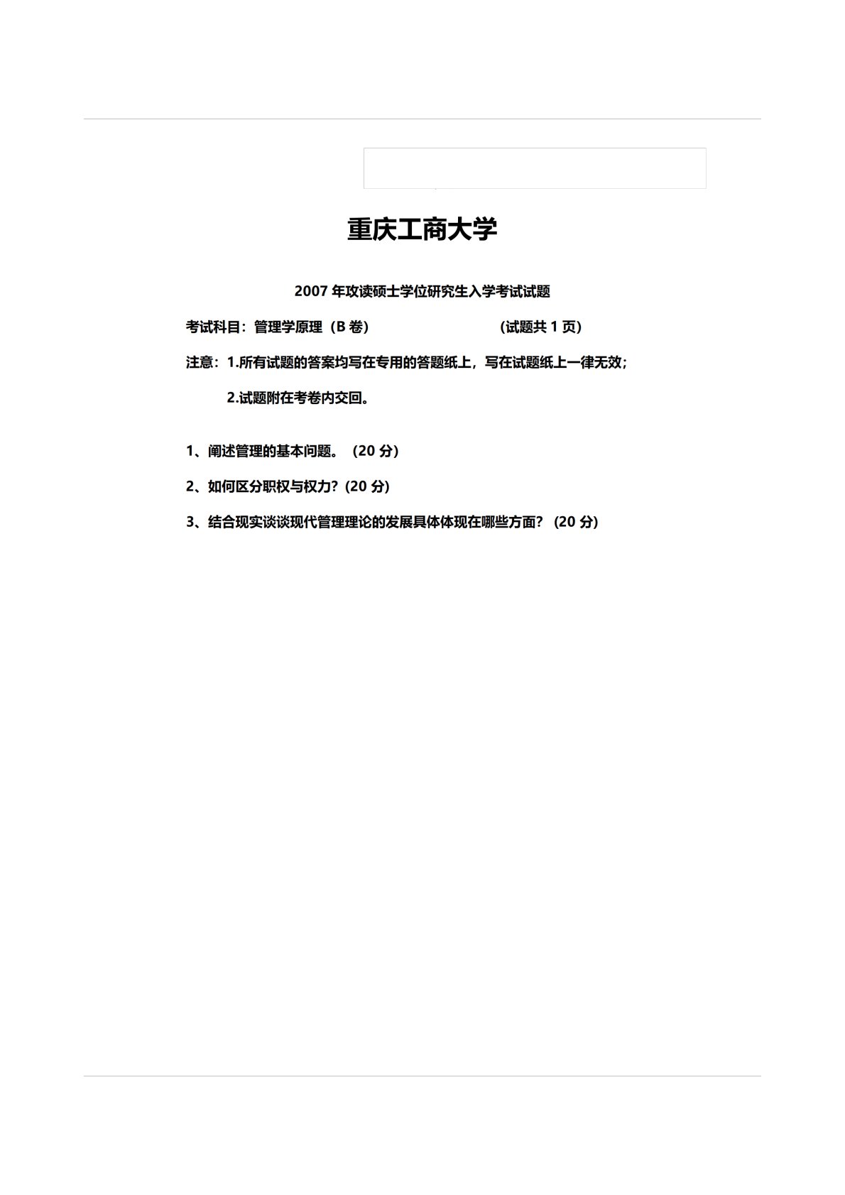 重庆工商大学811管理类综合2007年真题B卷
