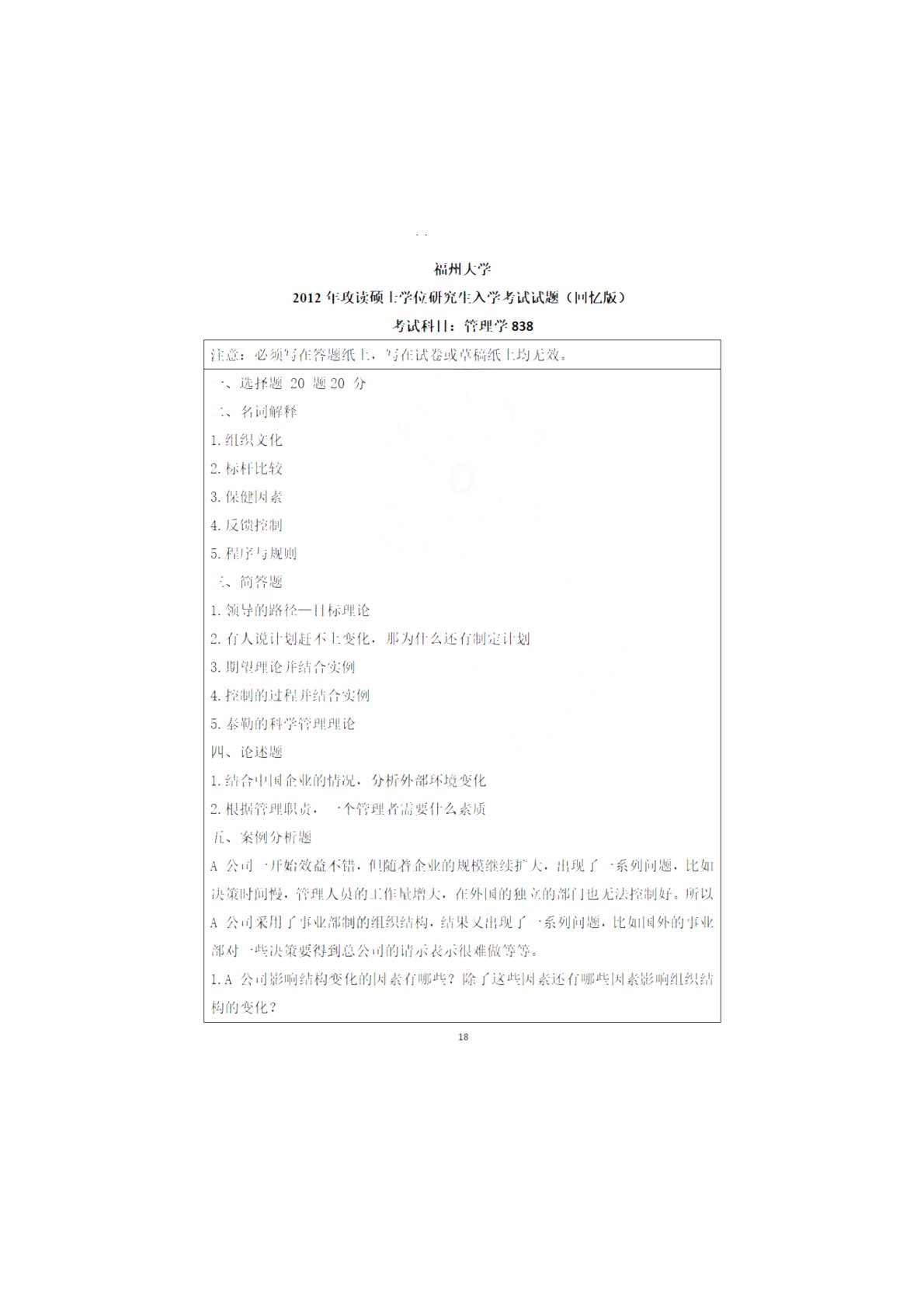福州大学838管理学综合2012年真题回忆版