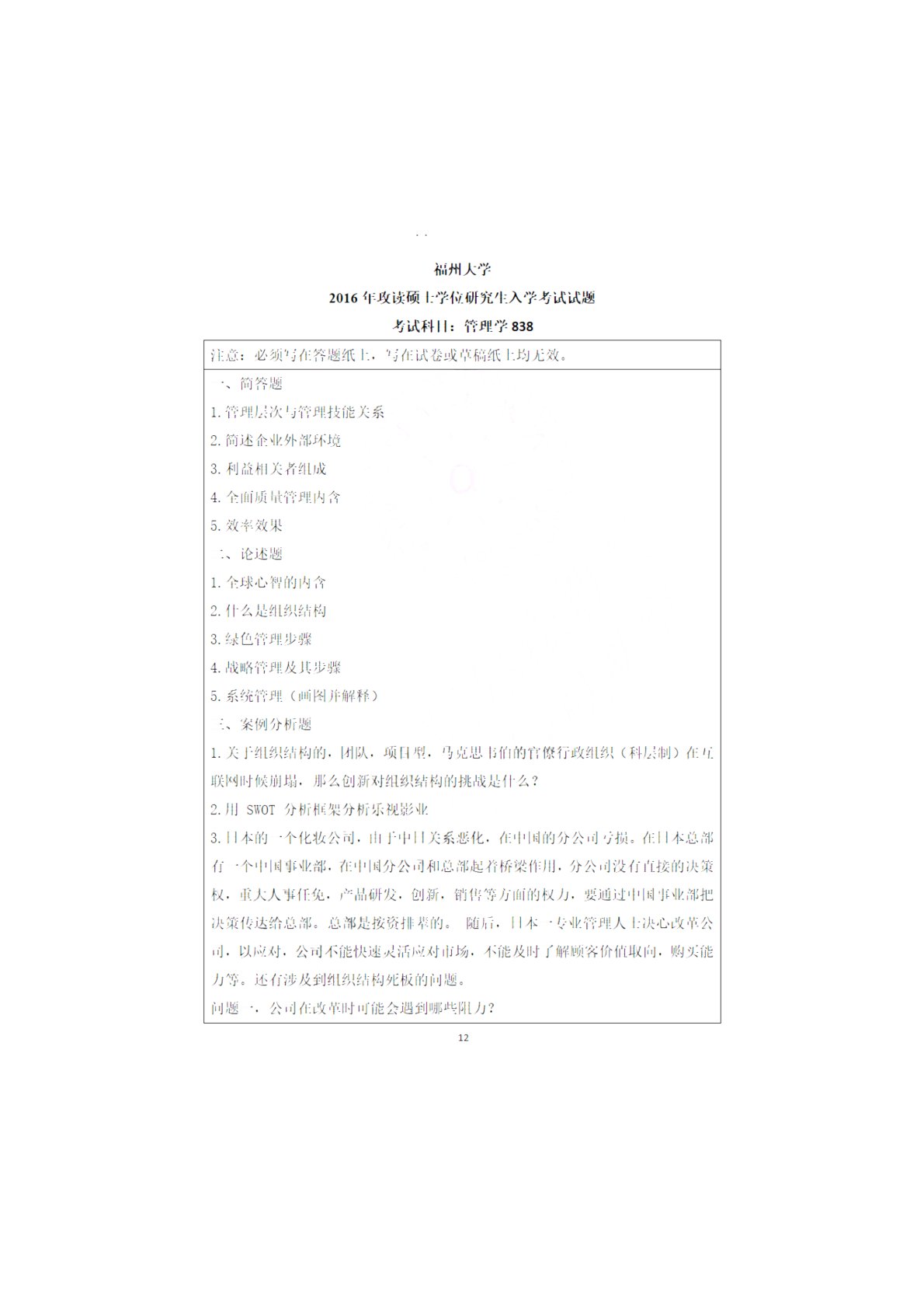 福州大学838管理学综合2016年真题