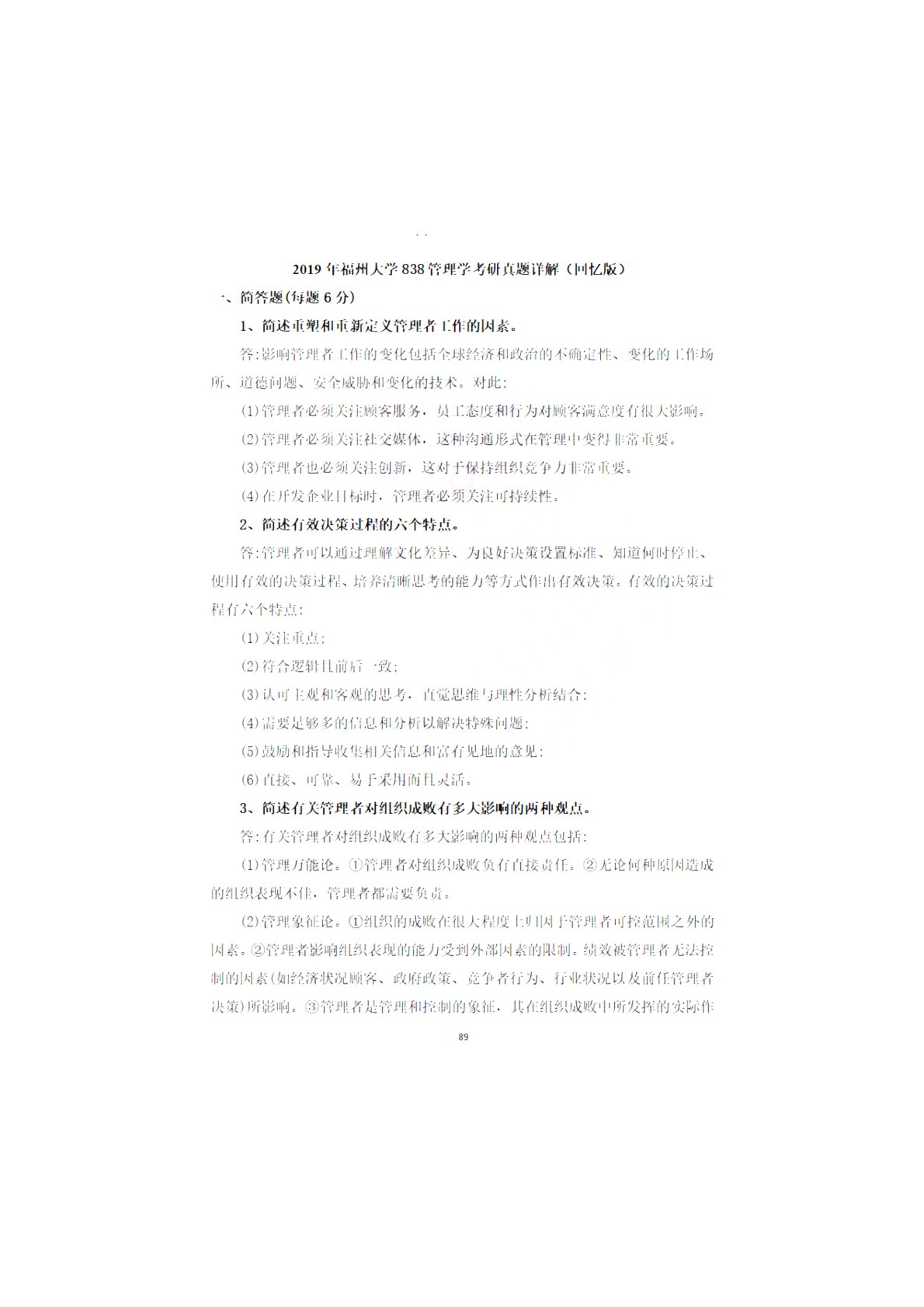 福州大学838管理学综合2019年真题回忆版答案