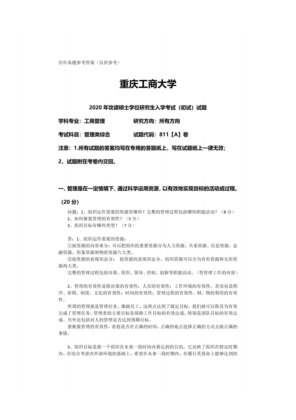 重庆工商大学811管理类综合2020年真题答案