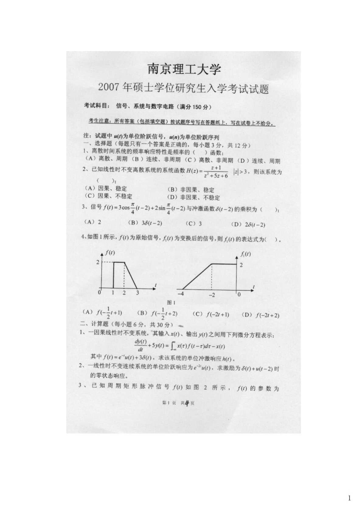 福州大学866信号与系统2007年南京理工大学信号系统与数字电路试题