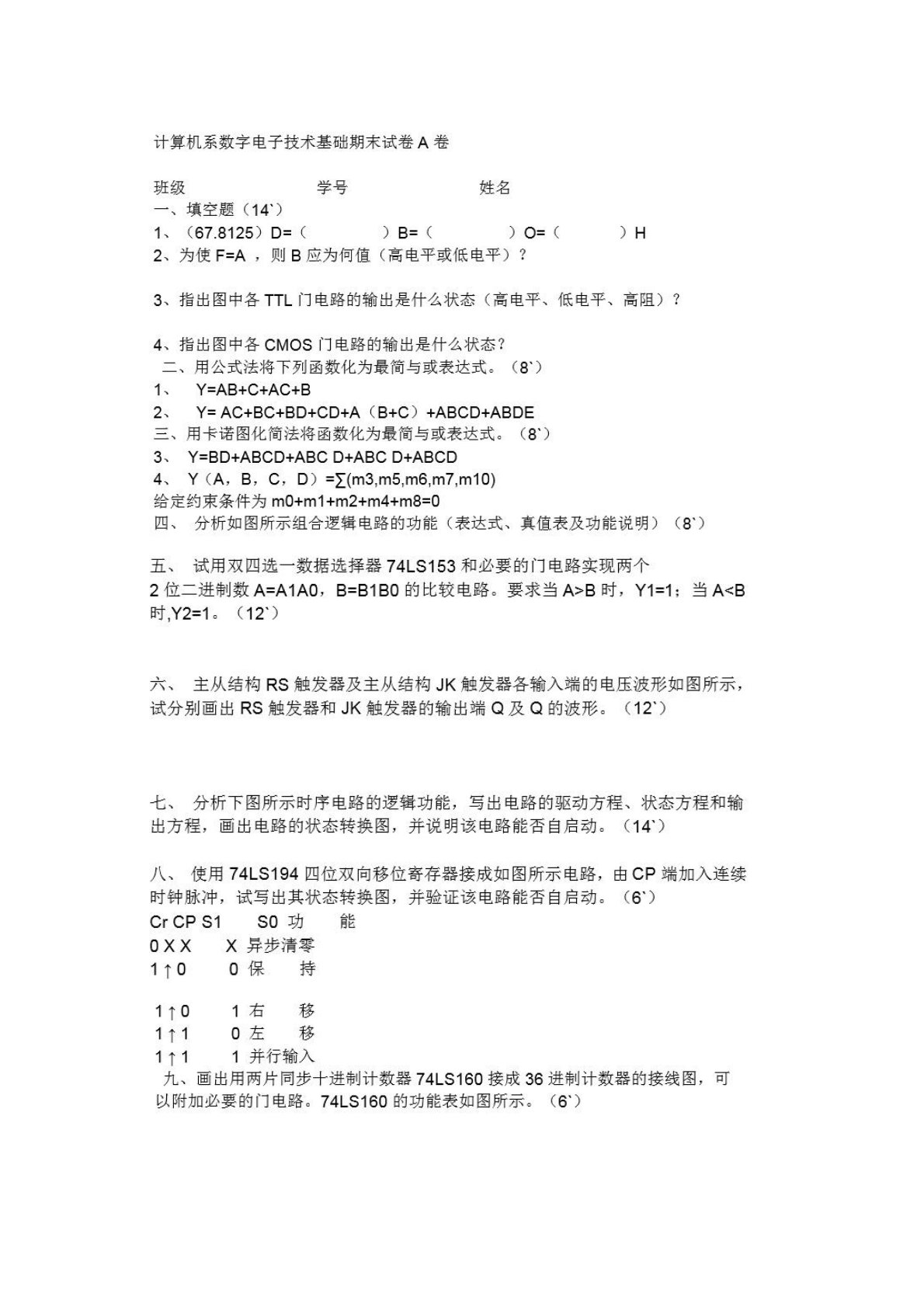 福州大学866信号与系统期末试卷