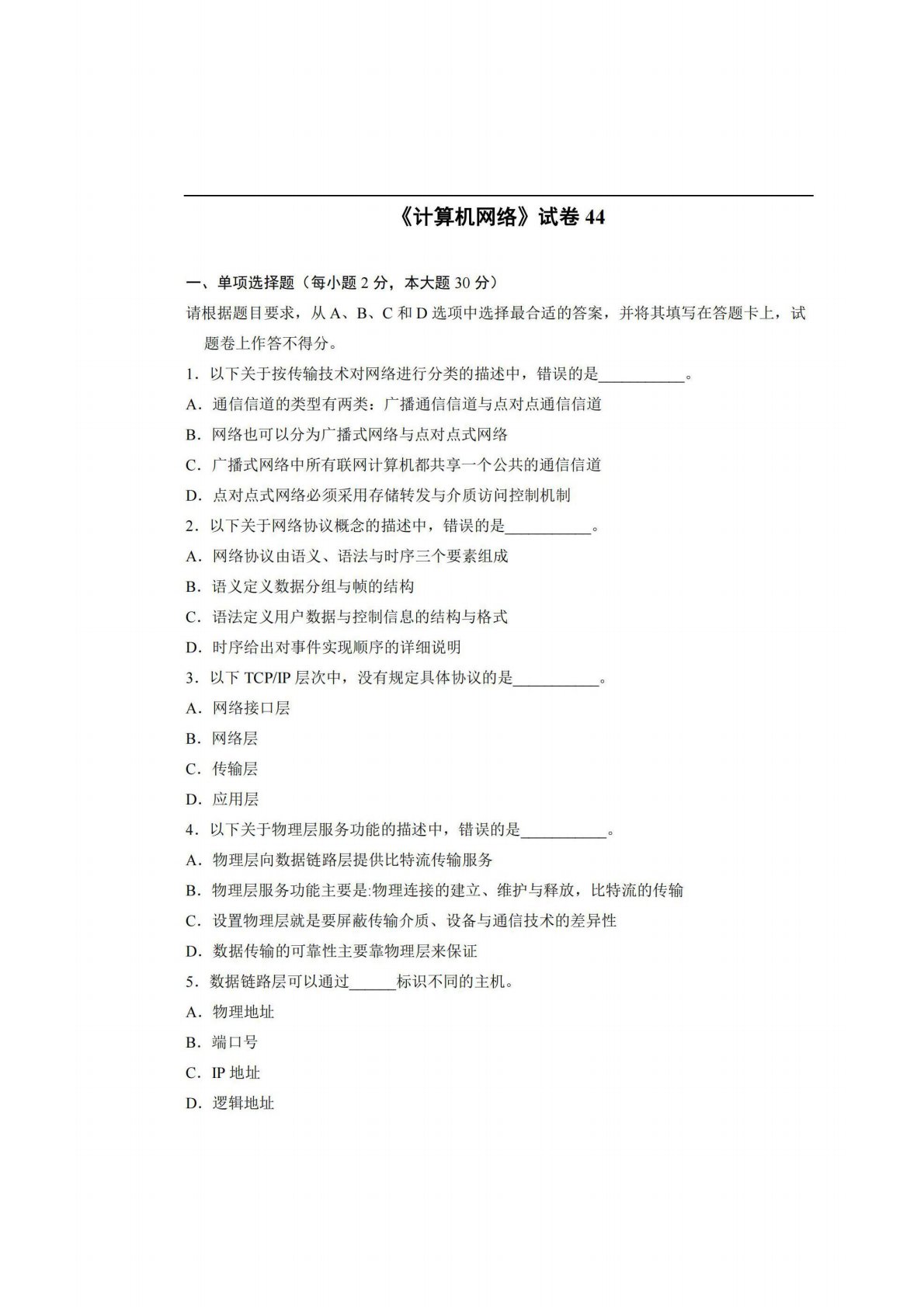 广西师范大学806计算机专业综合(含数据结构和计算机网络)试卷44
