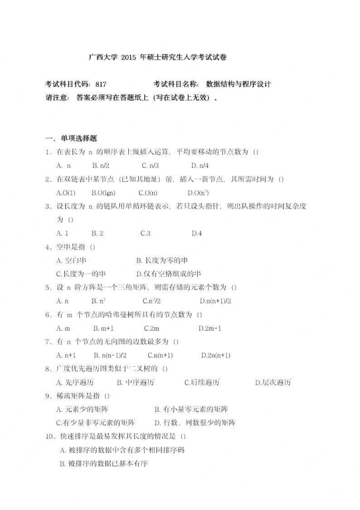 广西大学828程序设计与数据结构2015年真题