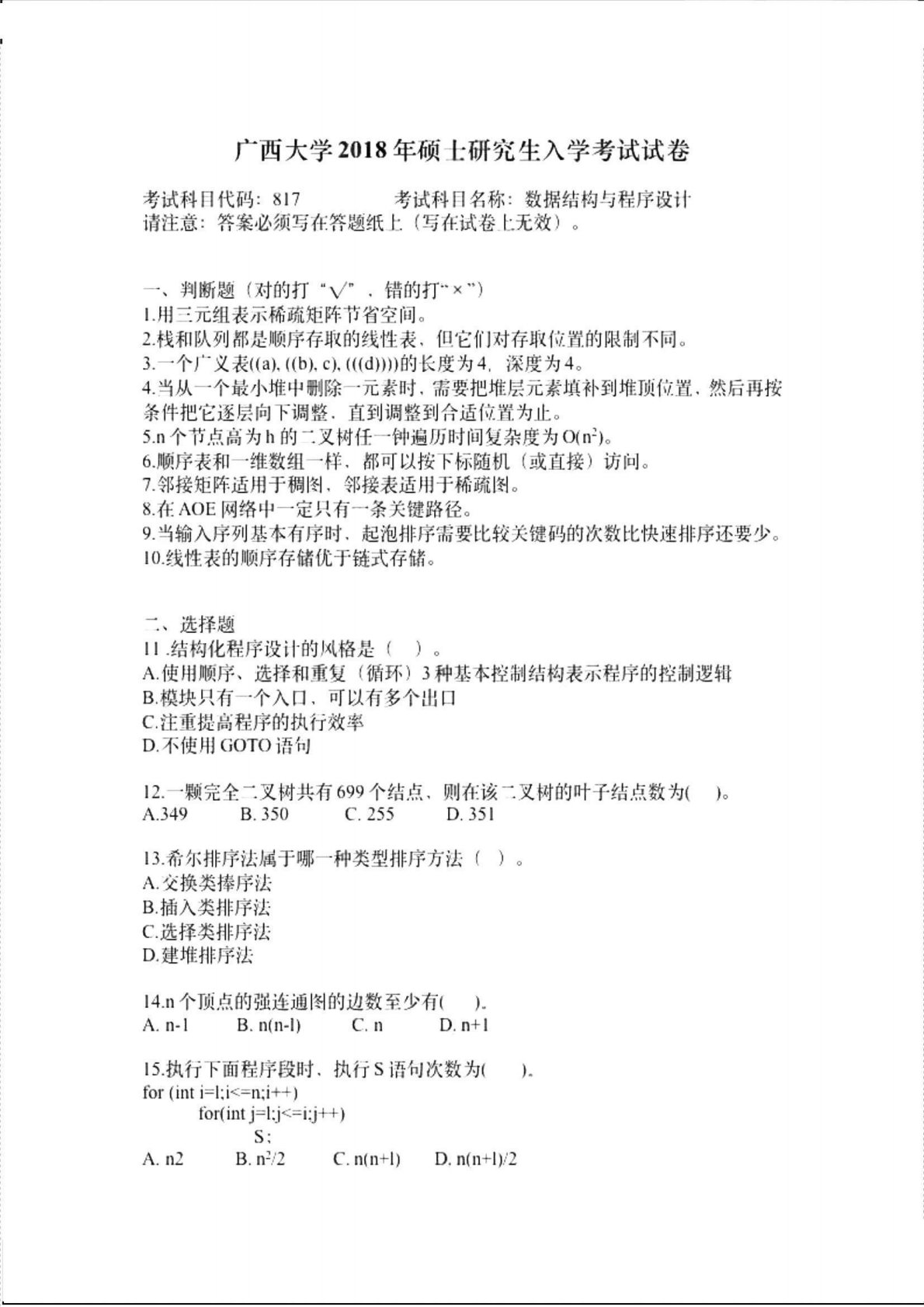 广西大学828程序设计与数据结构2018年真题