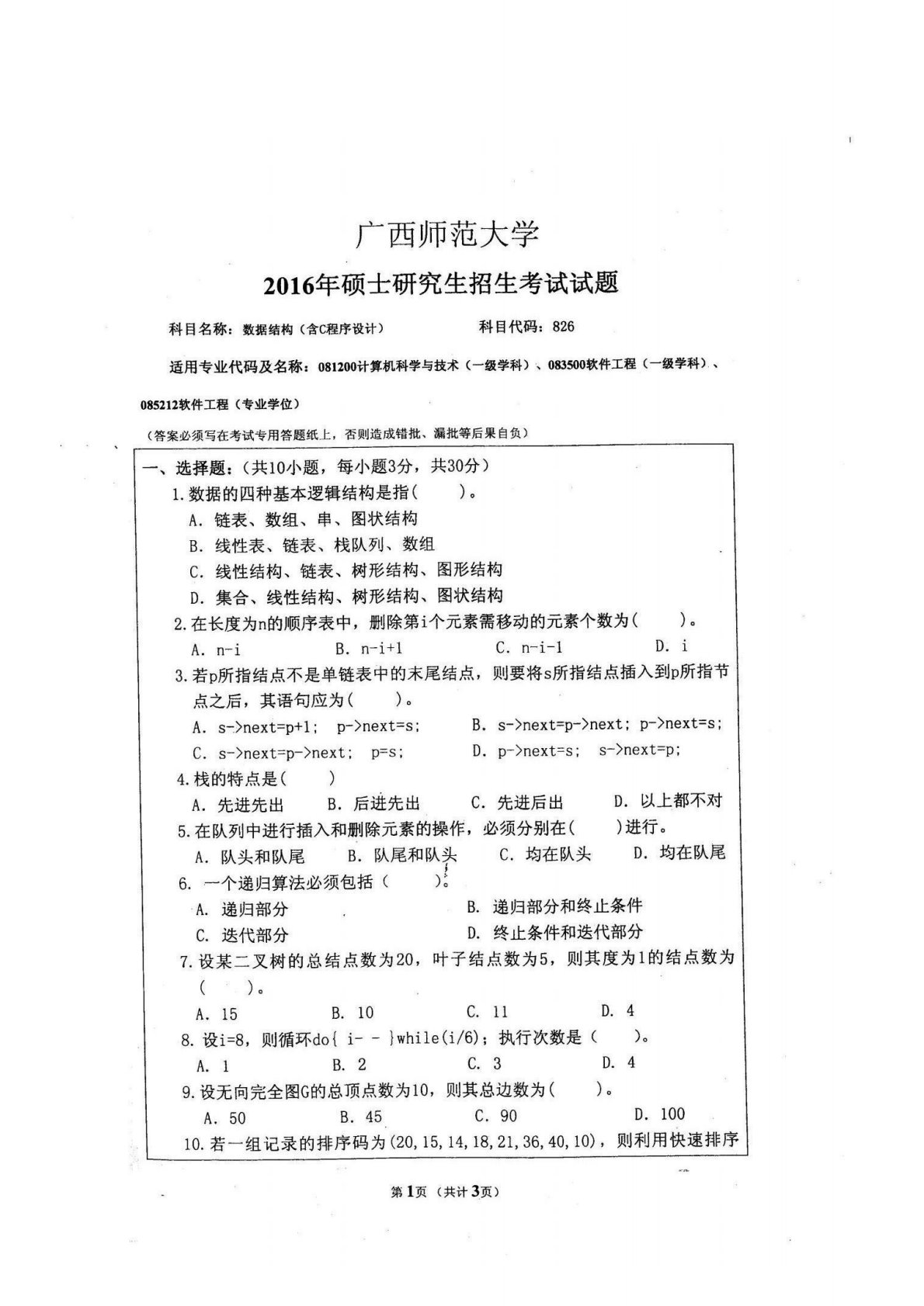 广西师范大学806计算机专业综合(含数据结构和计算机网络)2016年真题