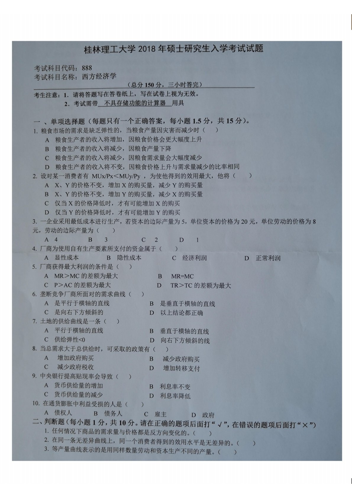 桂林理工大学888西方经济学2018年真题