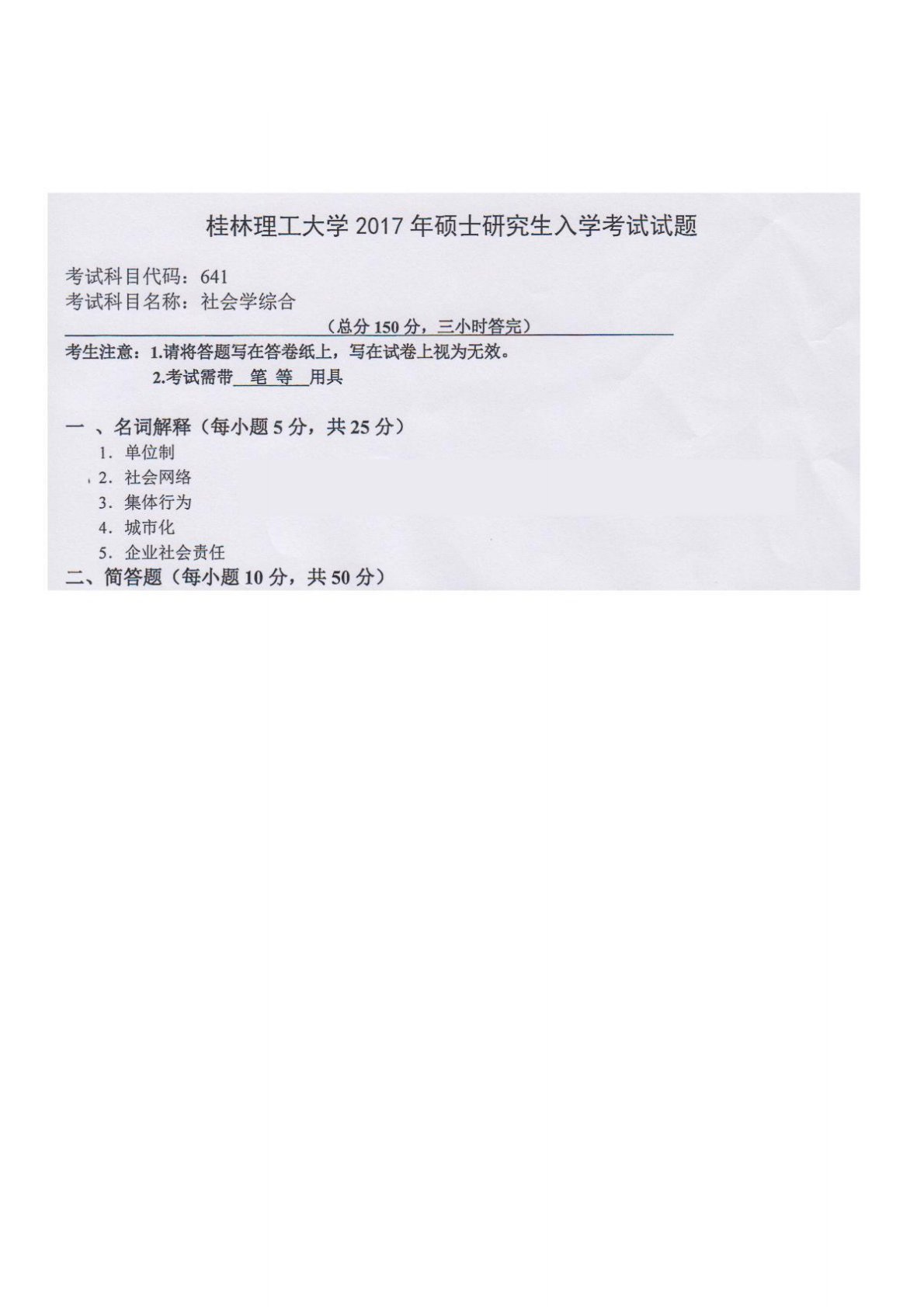 桂林理工大学641社会学综合2017年真题