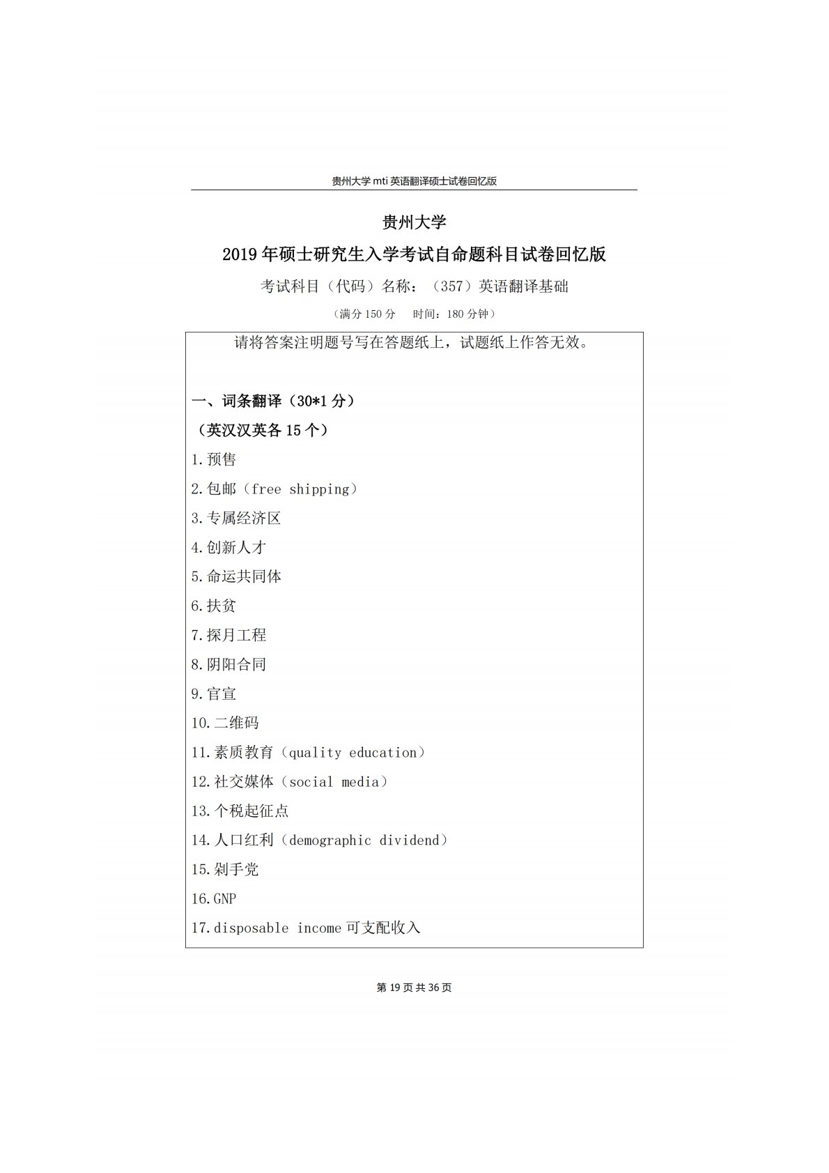 贵州大学357翻译基础(英语)2019年真题回忆版