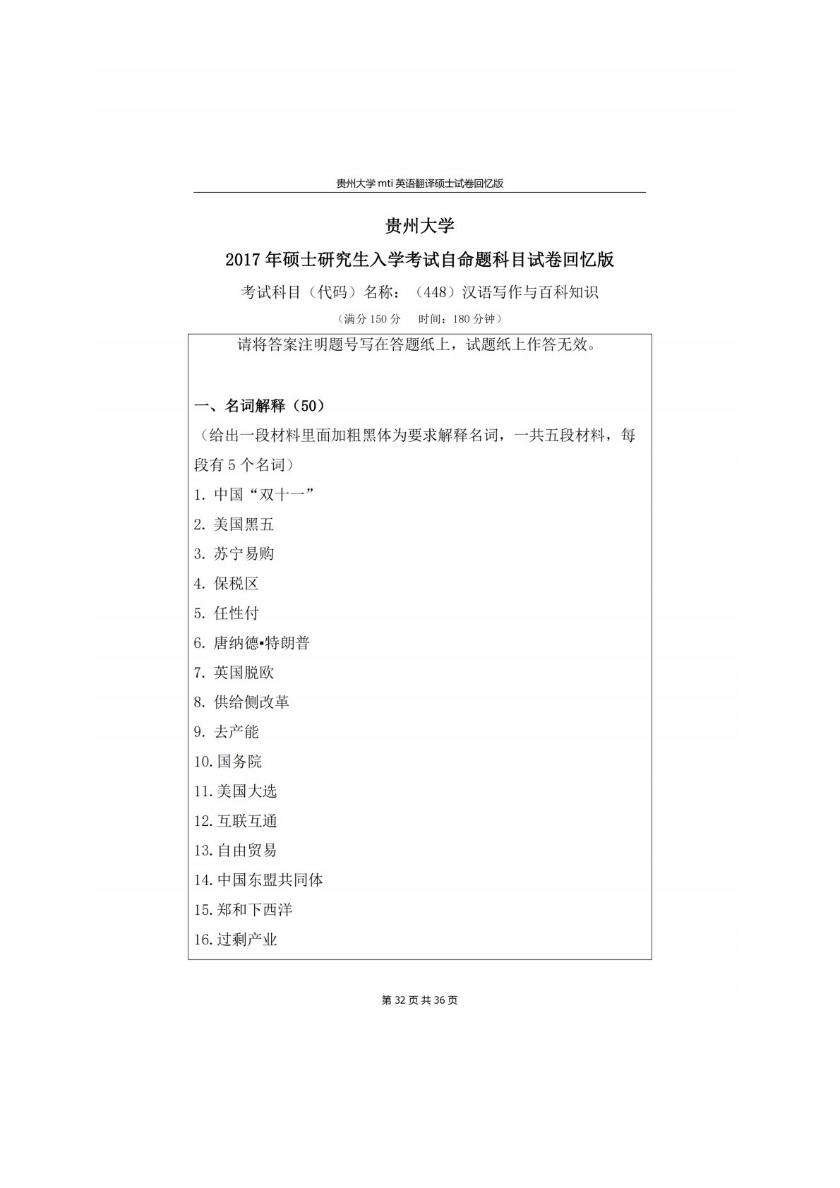 贵州大学448汉语写作与百科知识2017年真题回忆版