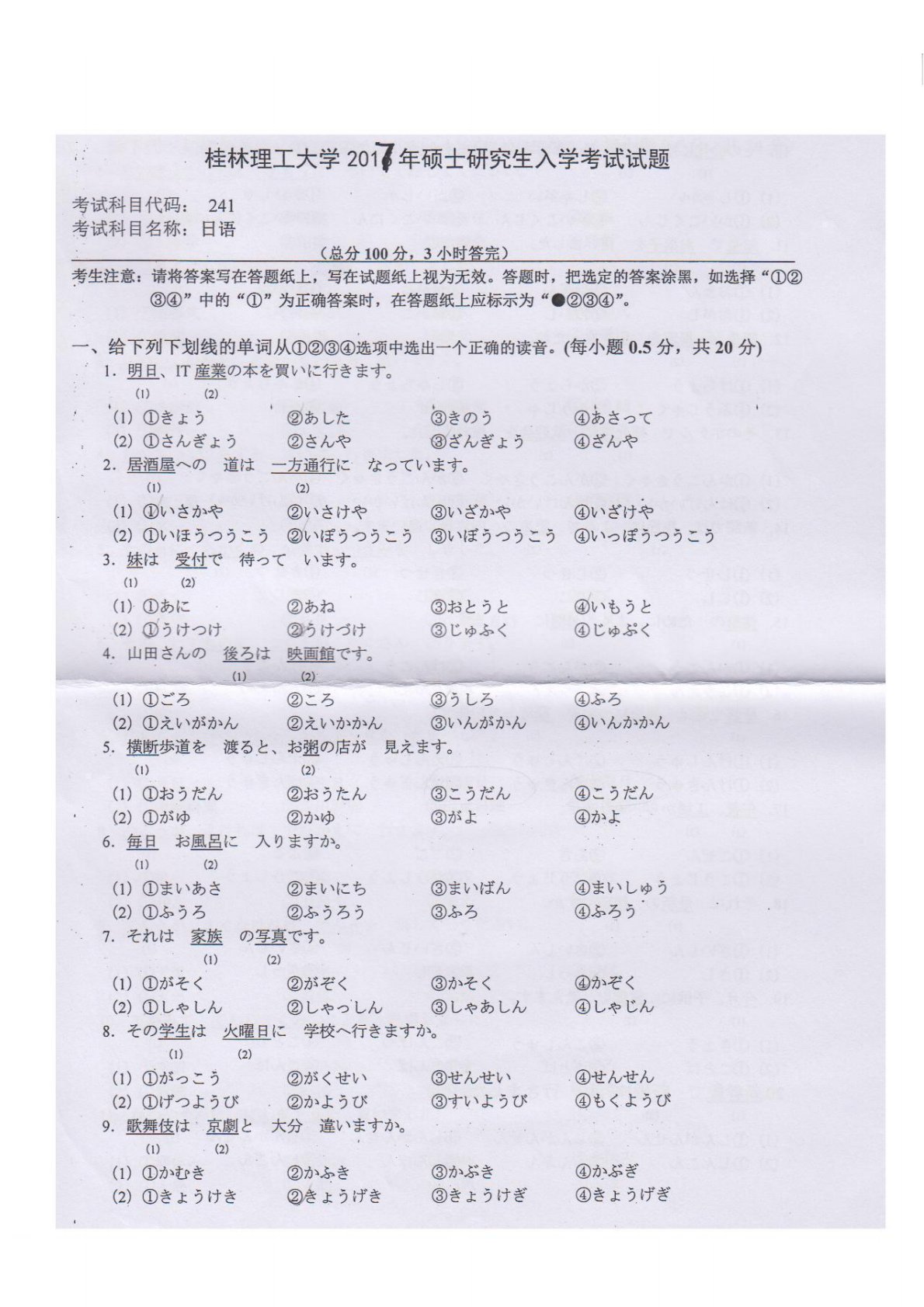 桂林理工大学241日语综合2017年真题
