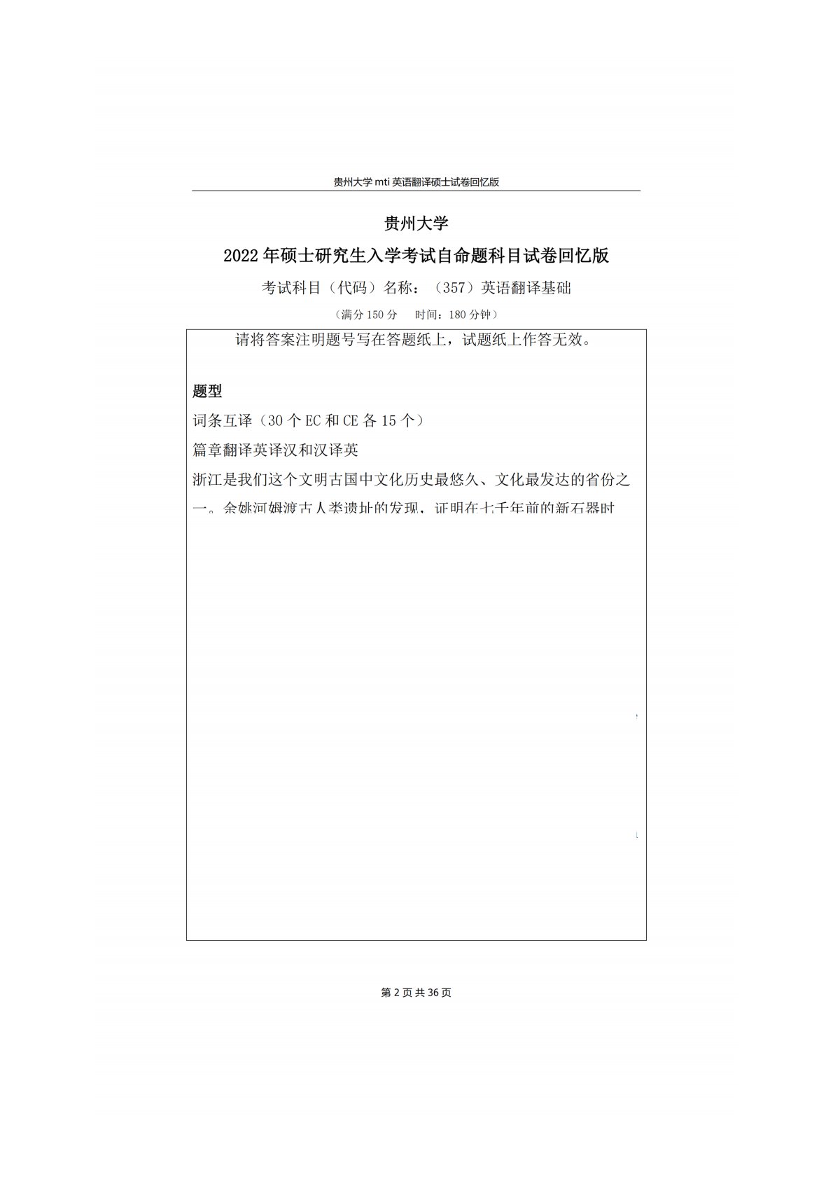 贵州大学357翻译基础(英语)2022年真题回忆版
