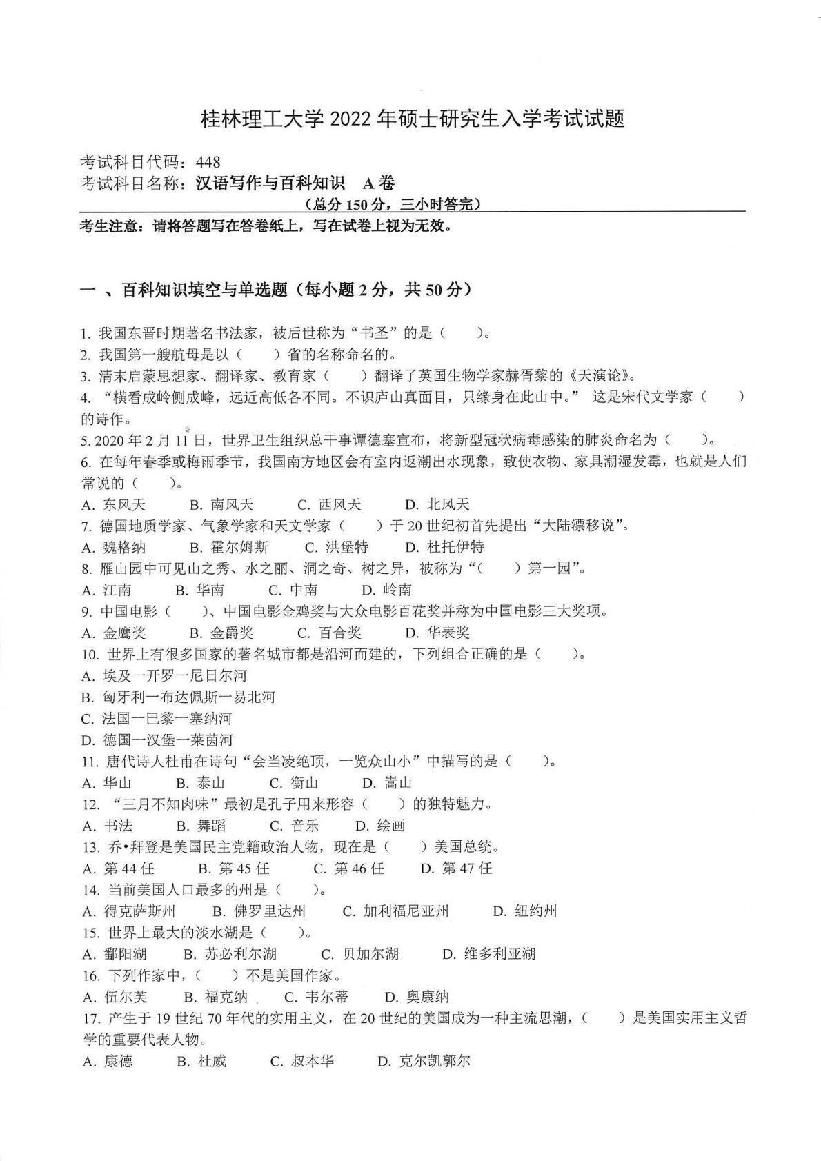 桂林理工大学448汉语写作与百科知识2022年真题
