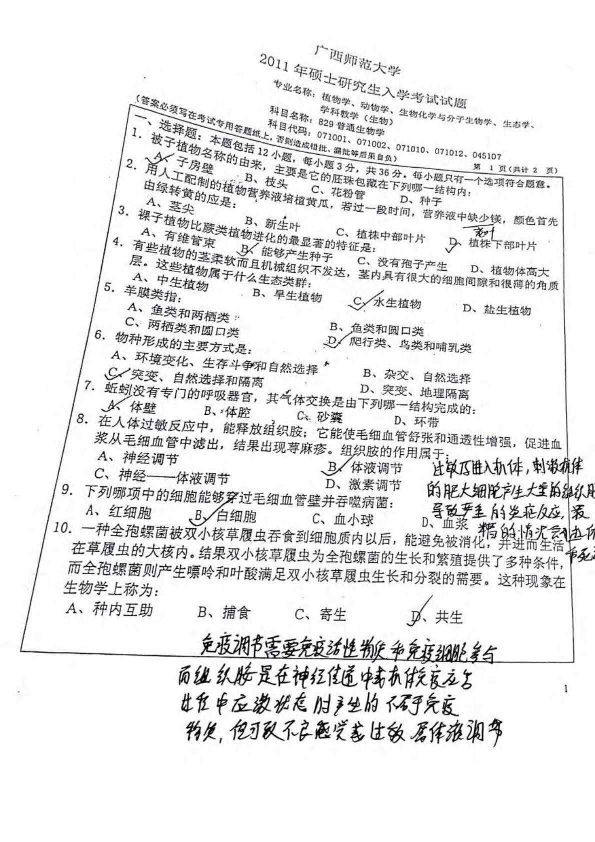 广西师范大学2011年829普通生物学考研真题答案解析