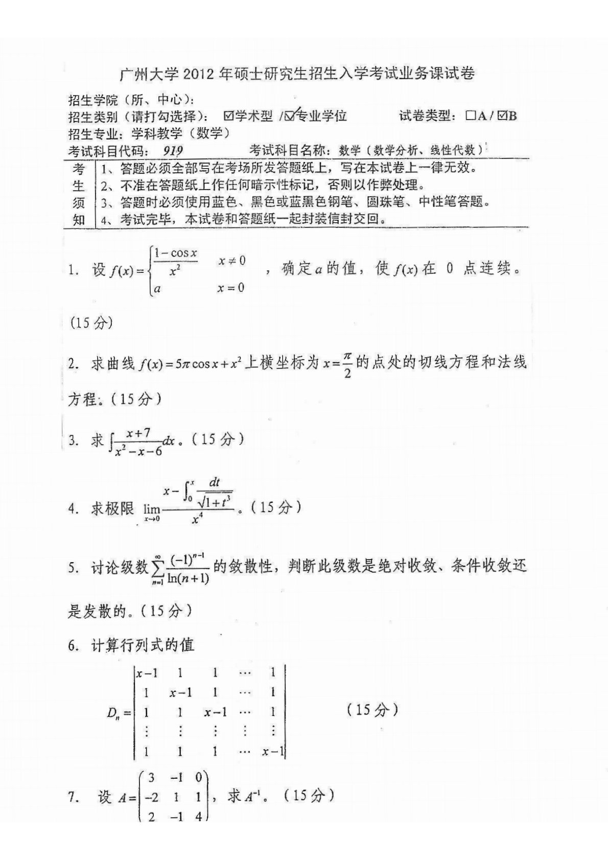 广州大学924数学(数学分析、线性代数)2012年真题