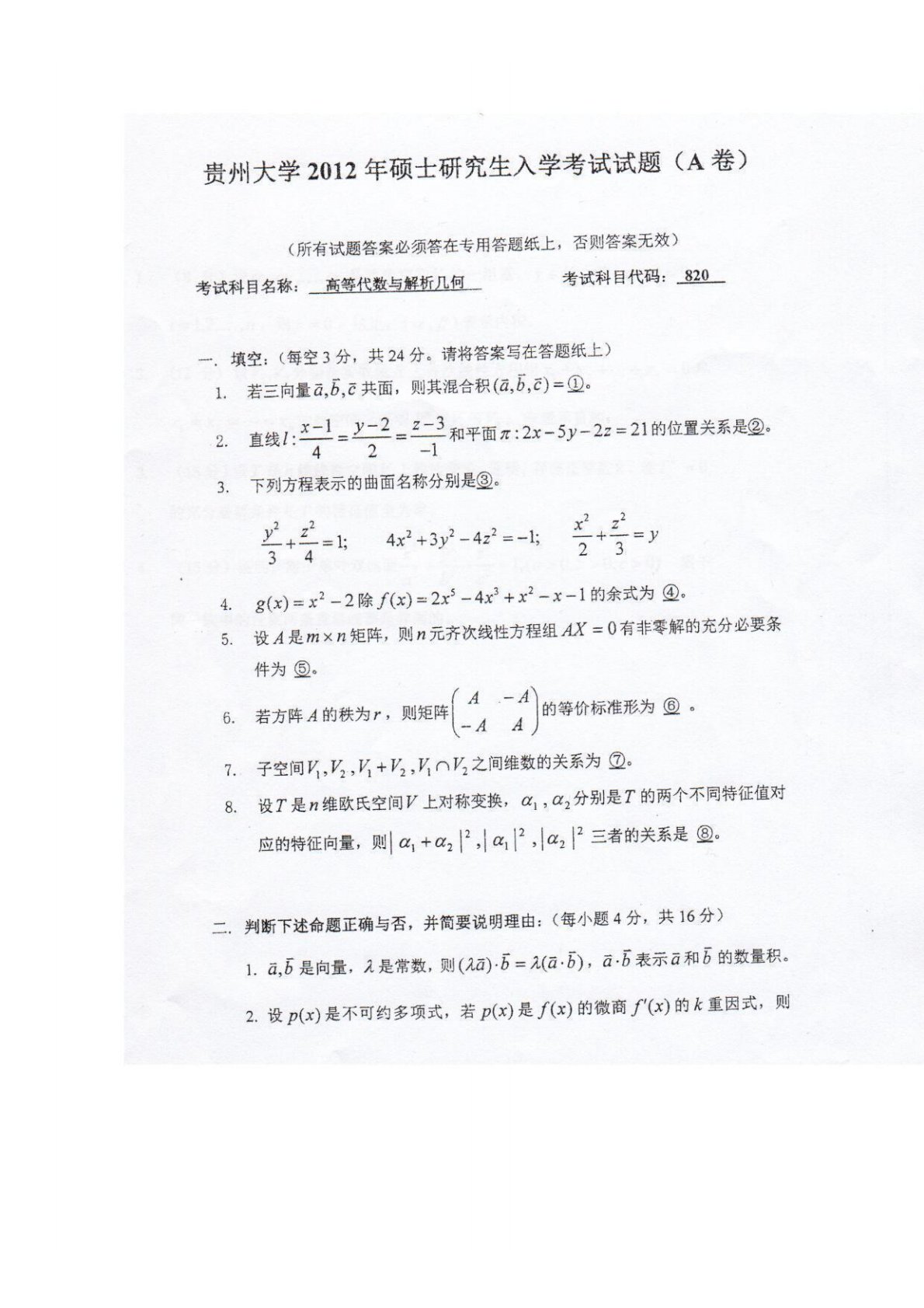 贵州大学818高等代数2012年真题