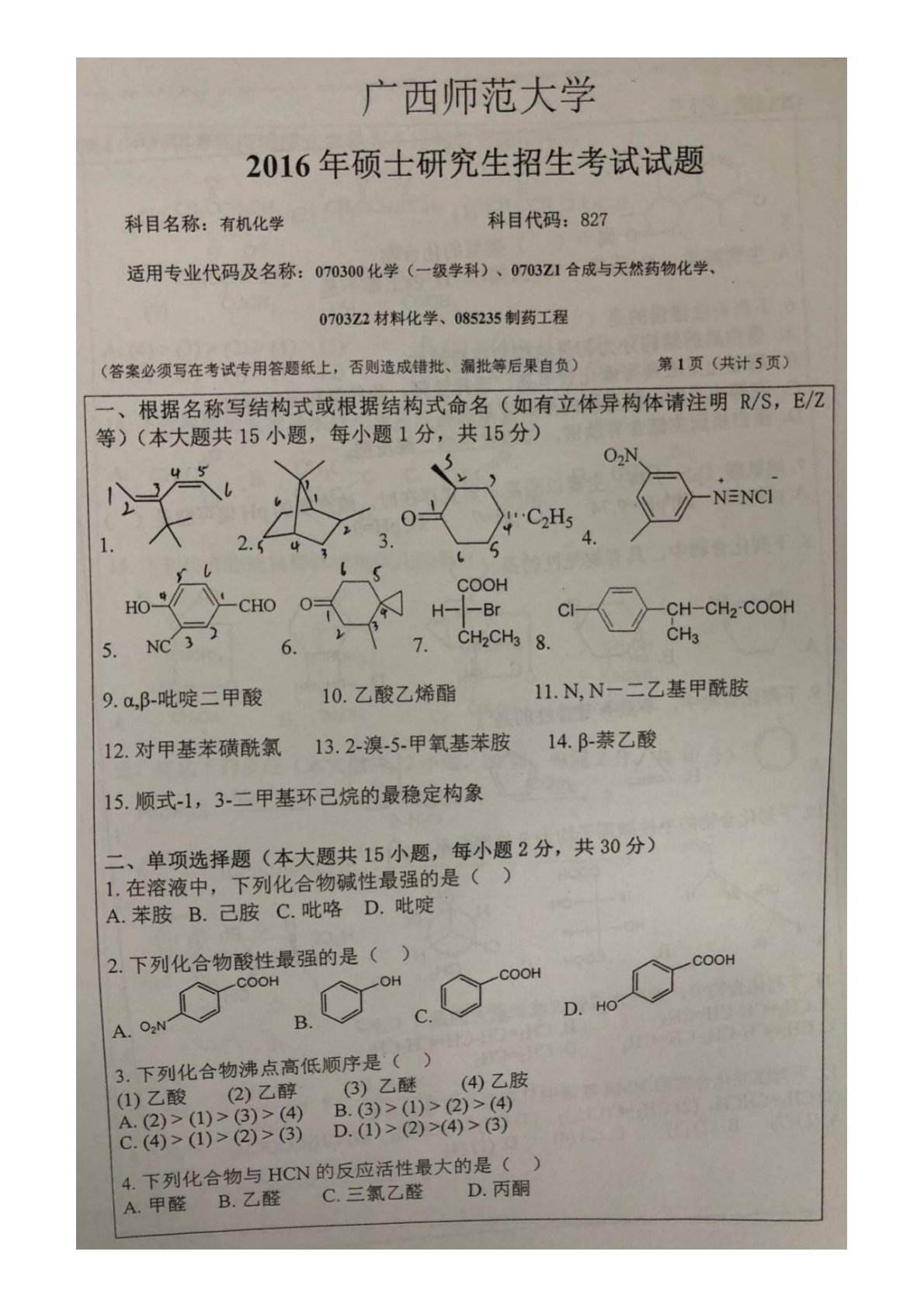 广西师范大学2016年827有机化学考研真题
