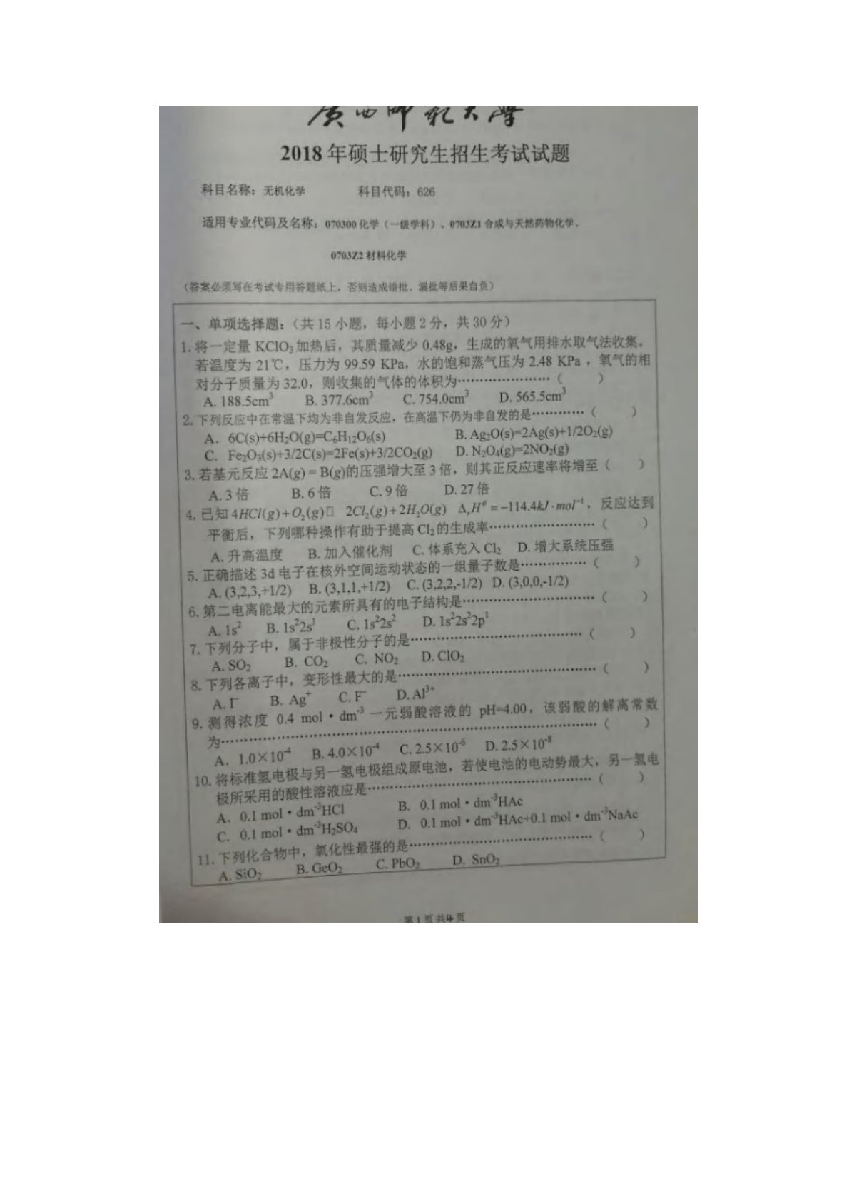 广西师范大学2018年626无机化学考研真题