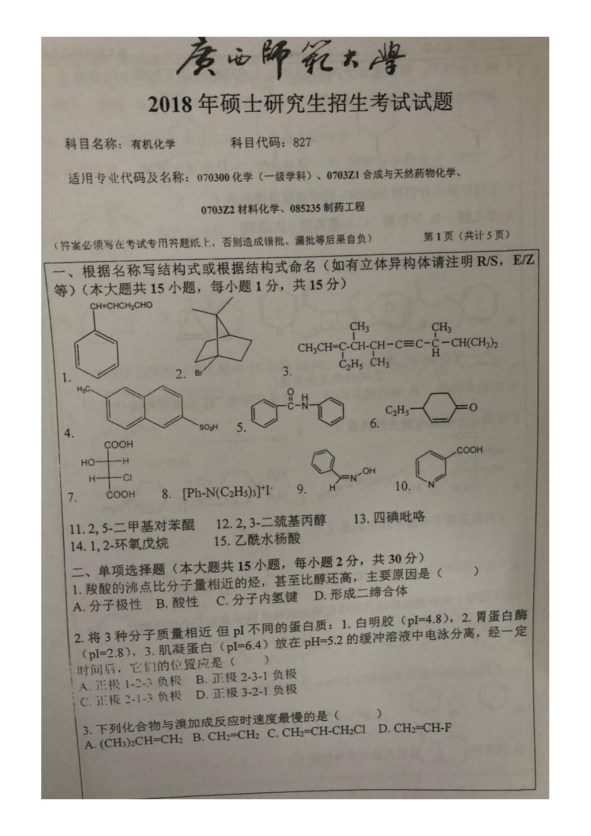 广西师范大学2018年827有机化学考研真题