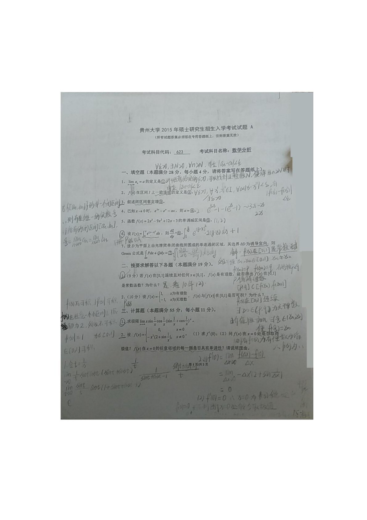 贵州大学623数学分析2015年真题答案