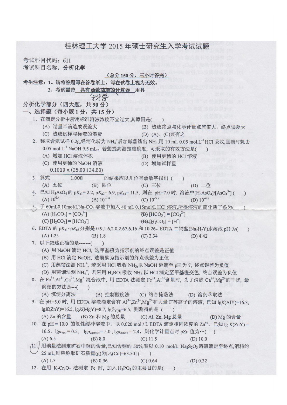 桂林理工大学611分析化学(含仪器分析40%)2015年真题