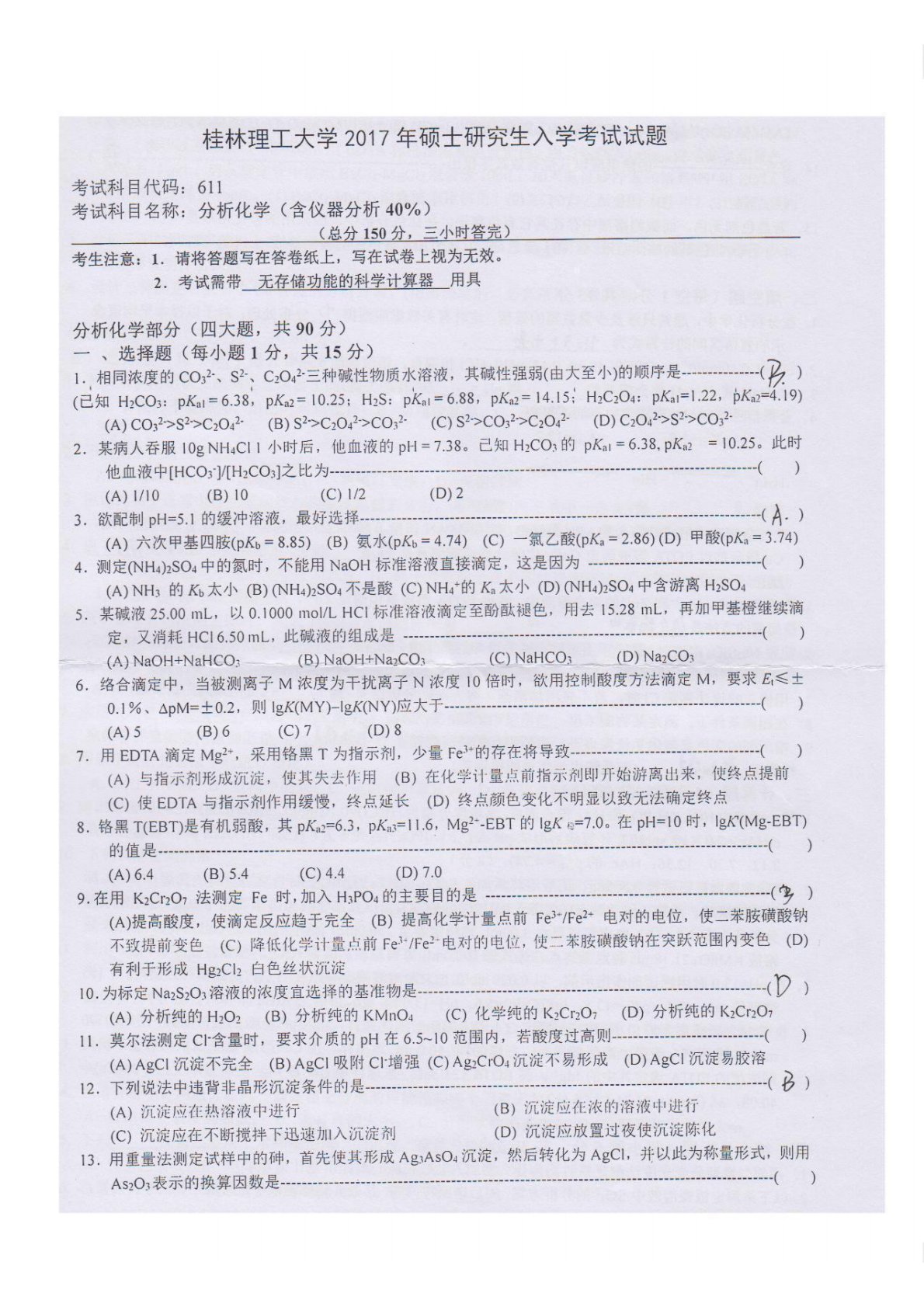 桂林理工大学611分析化学(含仪器分析40%)2017年真题