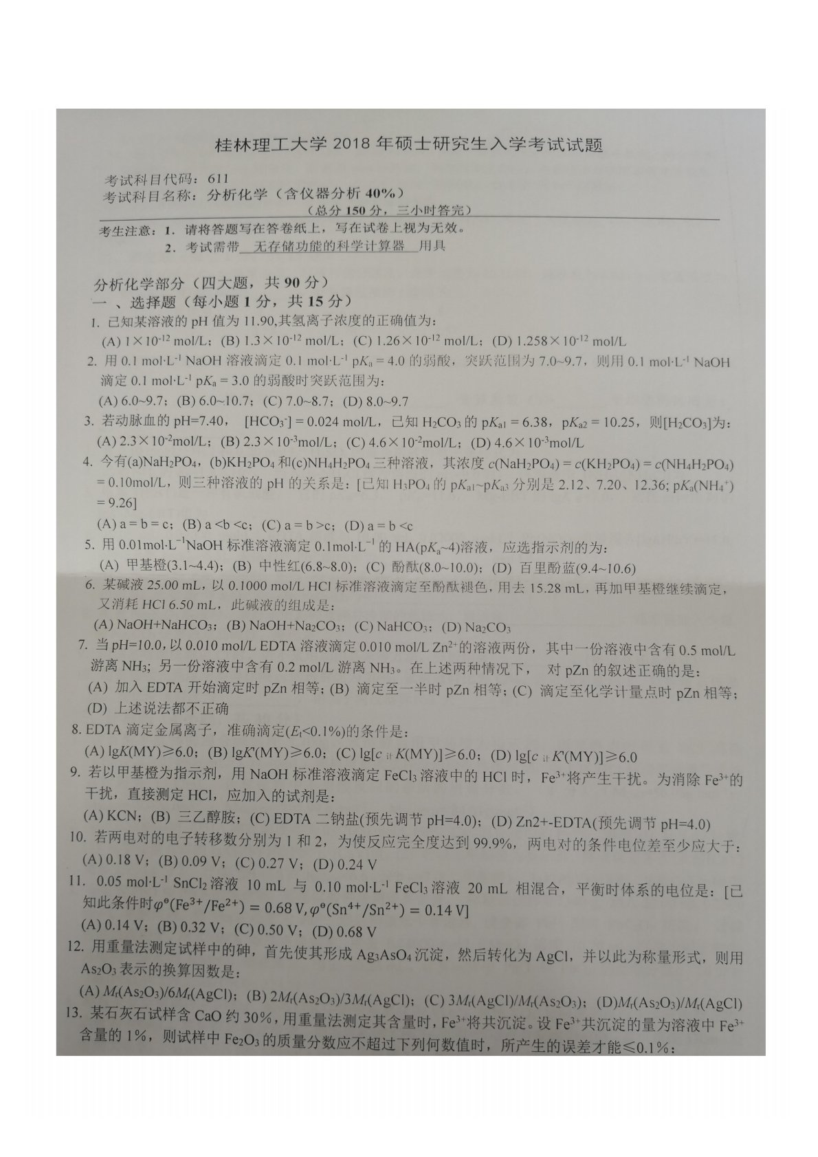 桂林理工大学611分析化学(含仪器分析40%)2018年真题