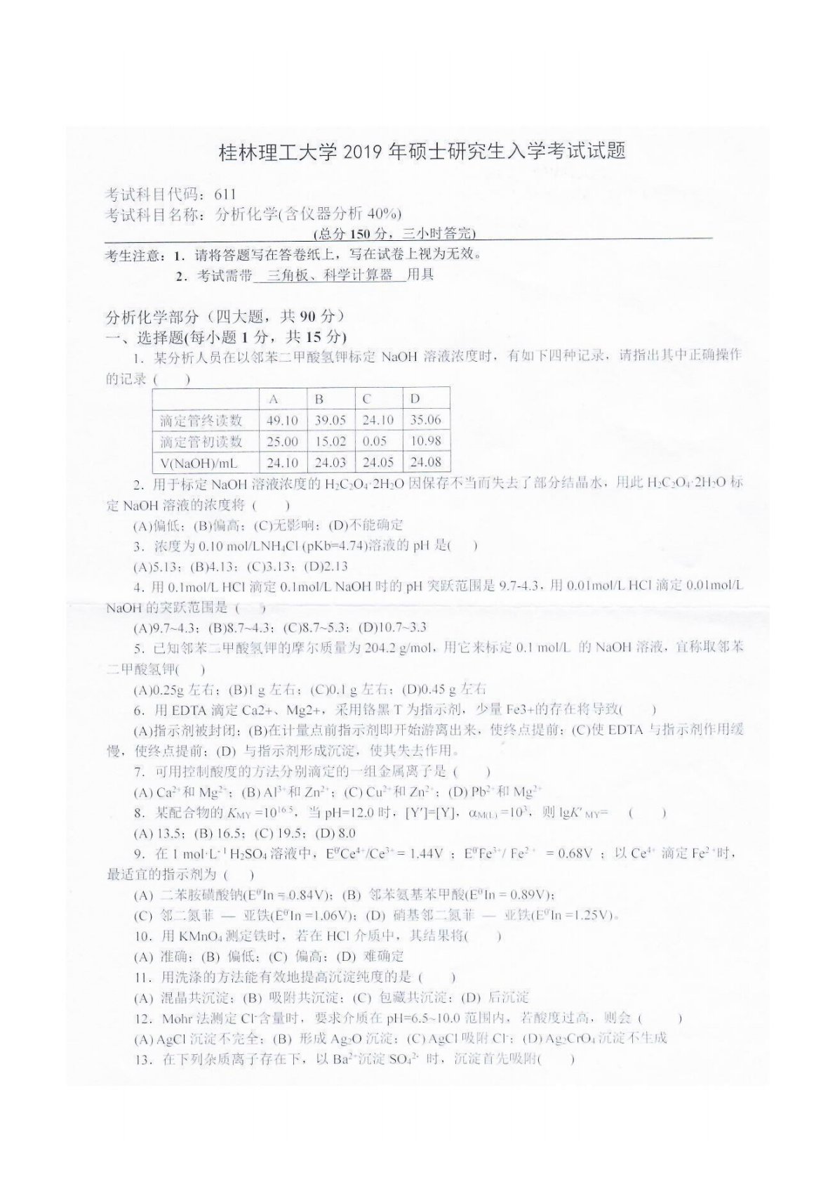 桂林理工大学611分析化学(含仪器分析40%)2019年真题